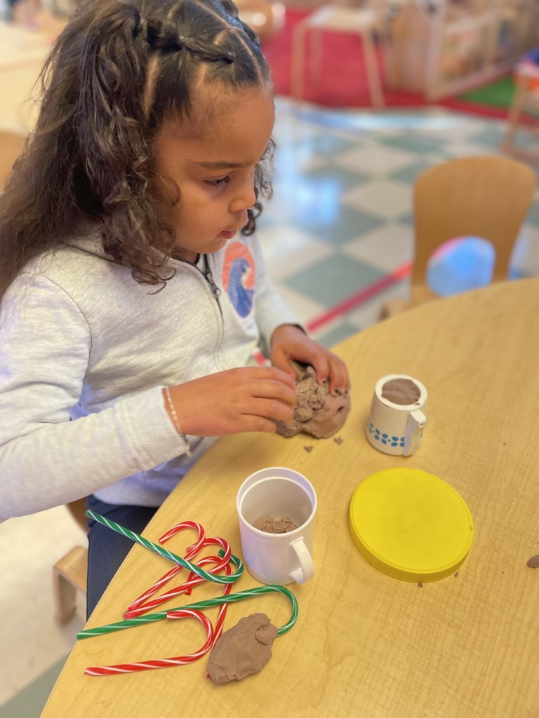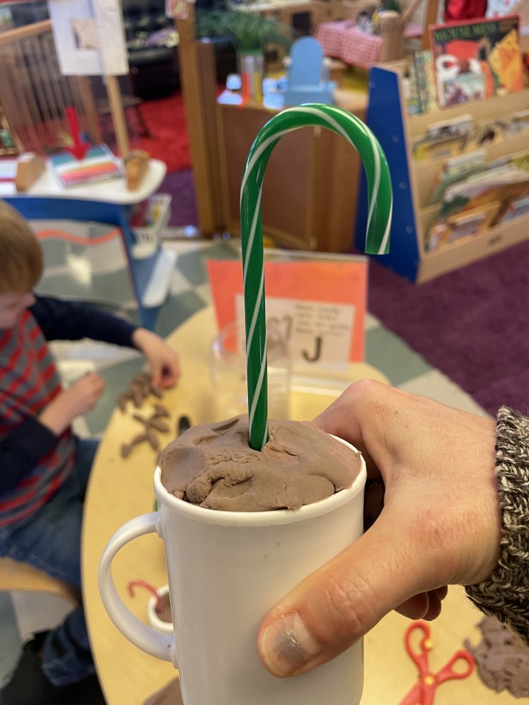 Ms Kristin found all the cups from the Family Corner that she could for children to fill up with brown play dough. Then we used pretend candy canes for stirring.