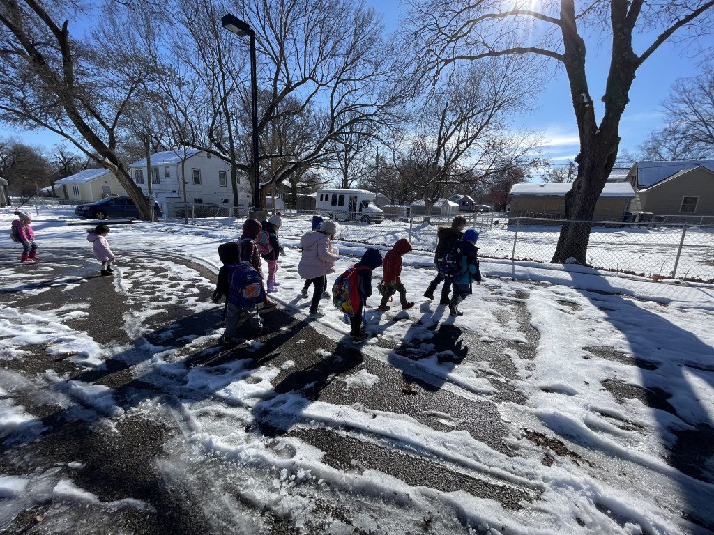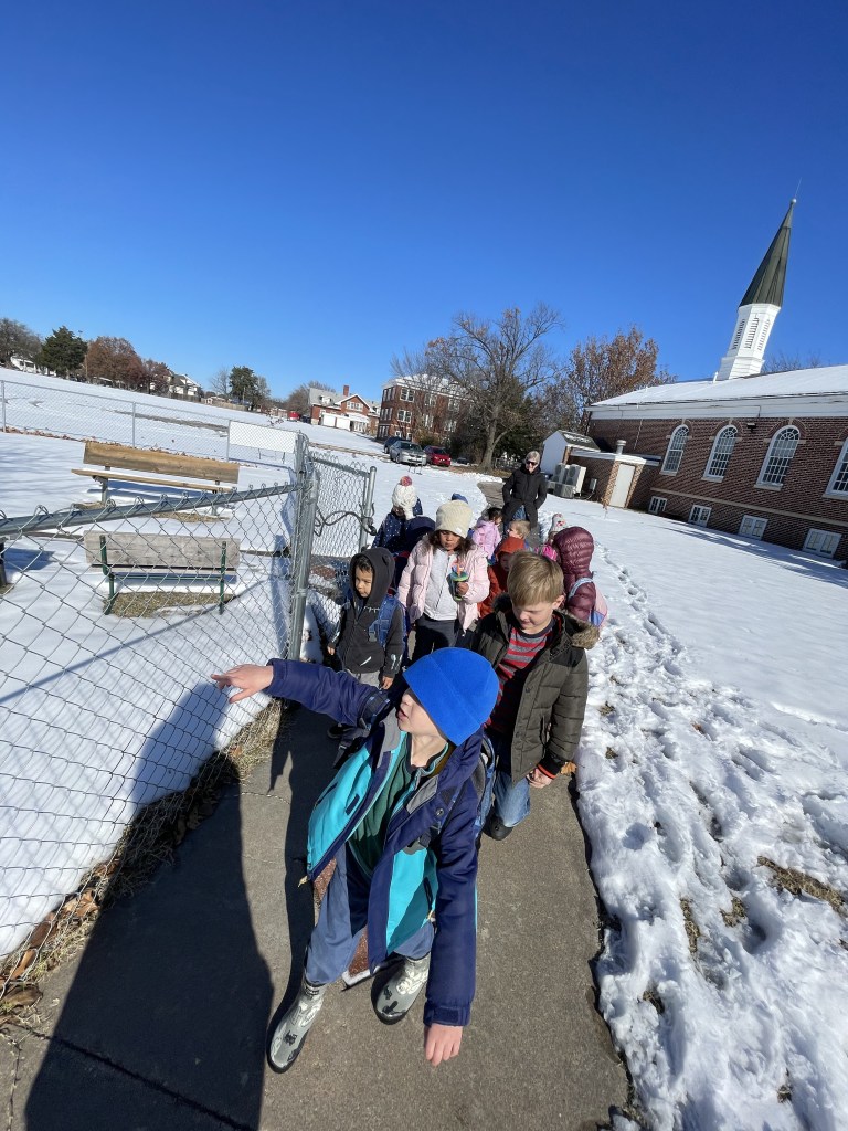 Our church preschool has a parking lot off of Pine Street that was filled with snow and tracks of all kinds. We had fun exploring the snow that was melting and that had refrozen in the shade. We also noticed houses in the neighborhood that had water dripping off the roofs…it was snow melting!