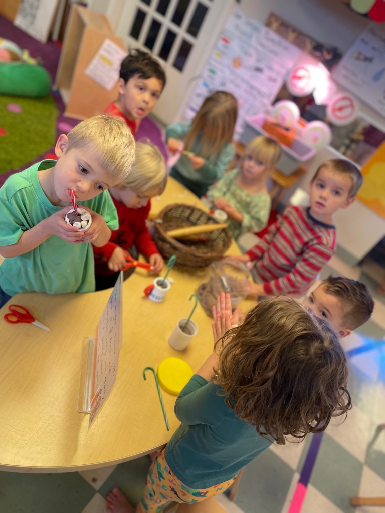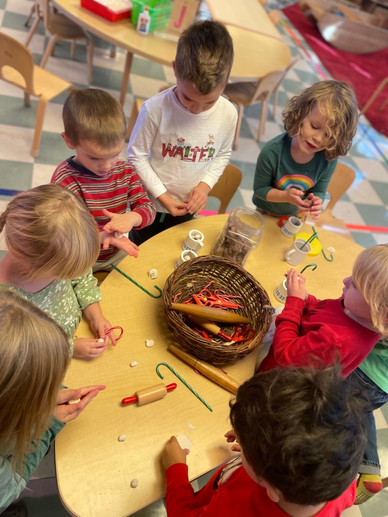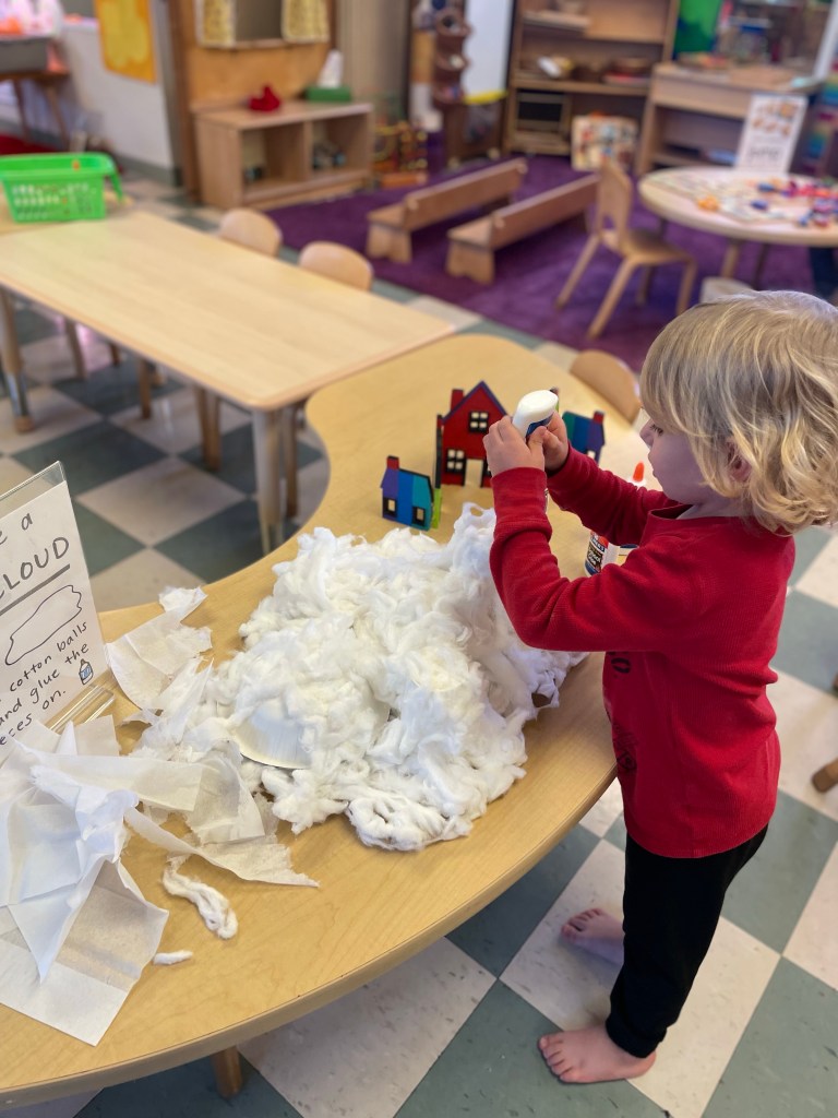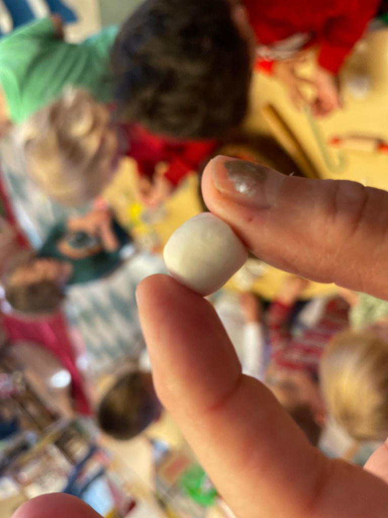 We were using the brown play dough for hot chocolate again and one friend noticed we didn’t have any white marshmallows. Ms Kristin was very happy to find a container of white play dough that we could use to make pretend marshmallows.