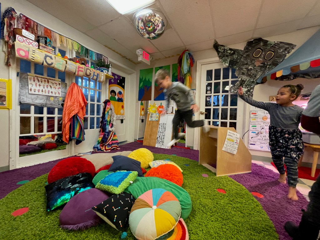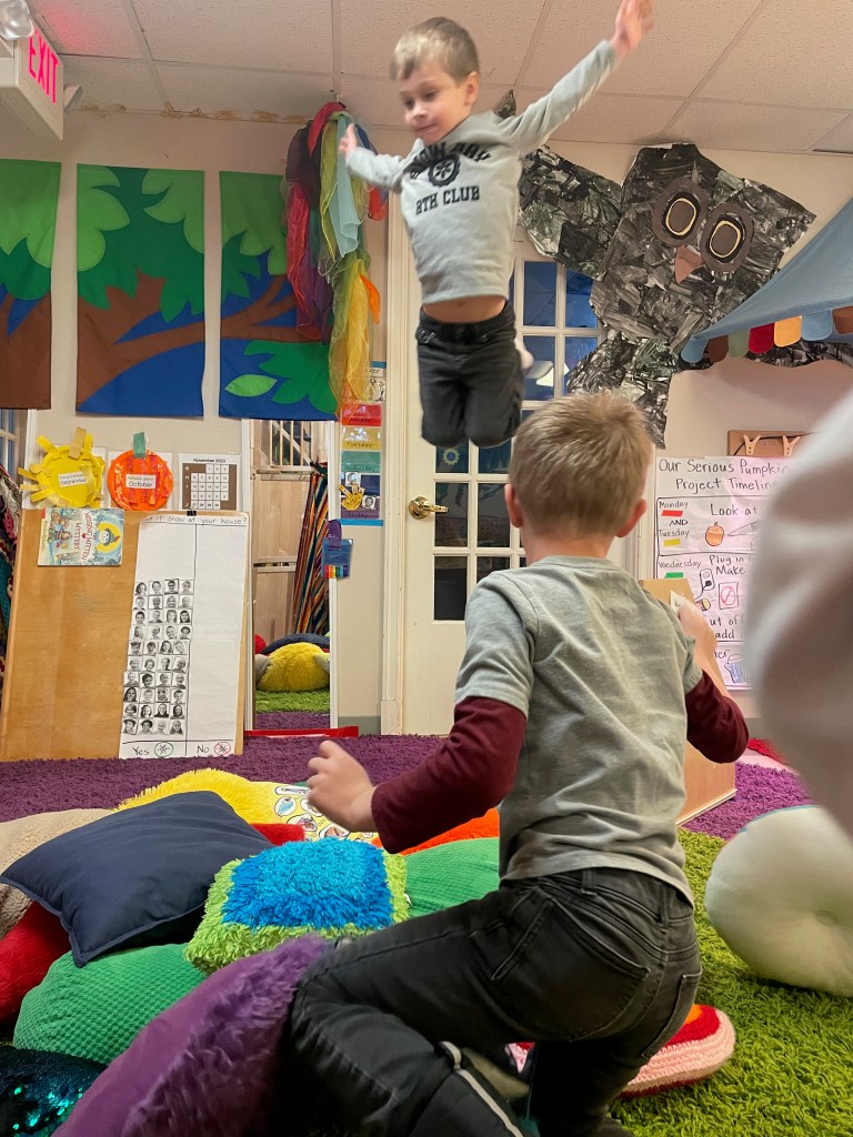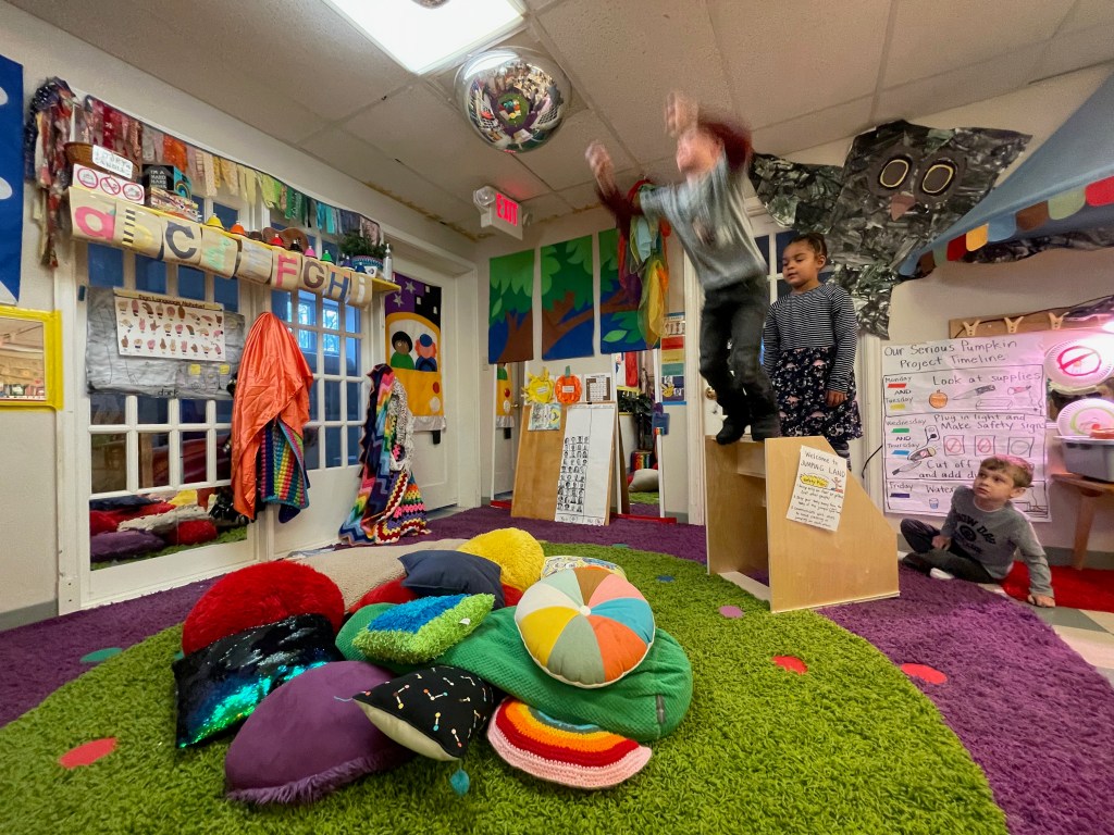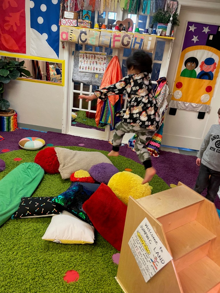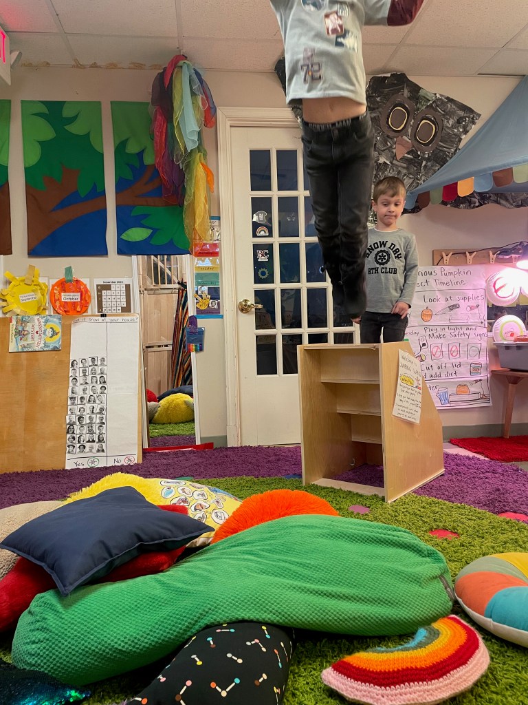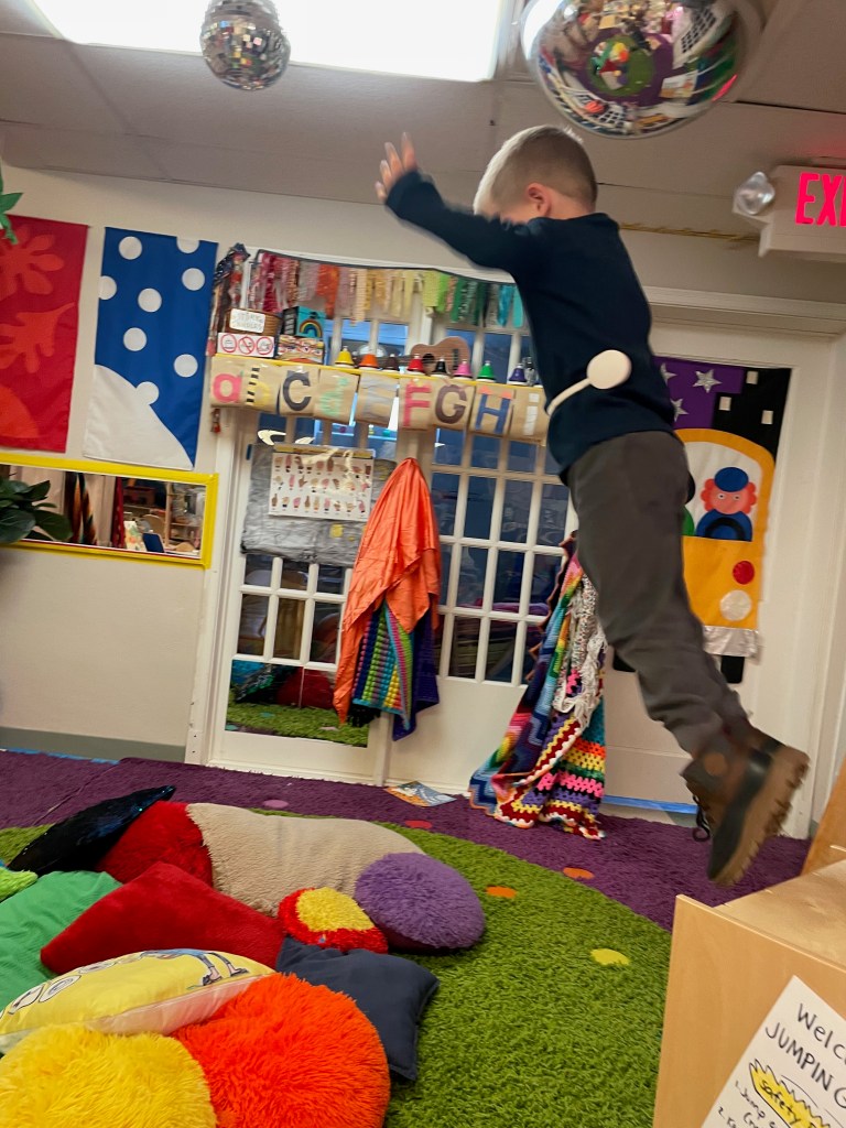 Ms Kristin hung the snow cloud up over a table so that we could have animals, trains and pretend people go under the snow cloud. At Snack Time the tables moved and the snow cloud was in the middle for all of us to look at.