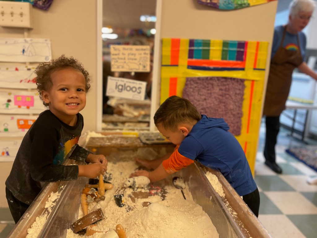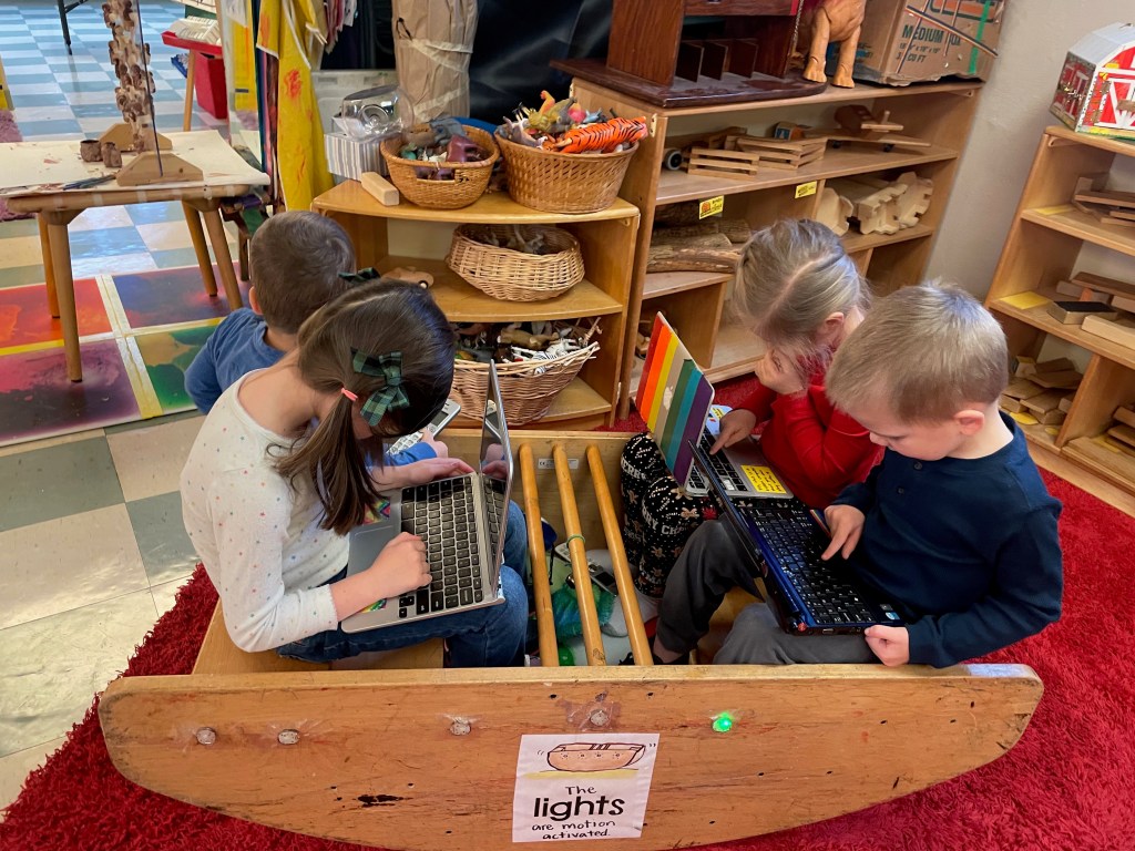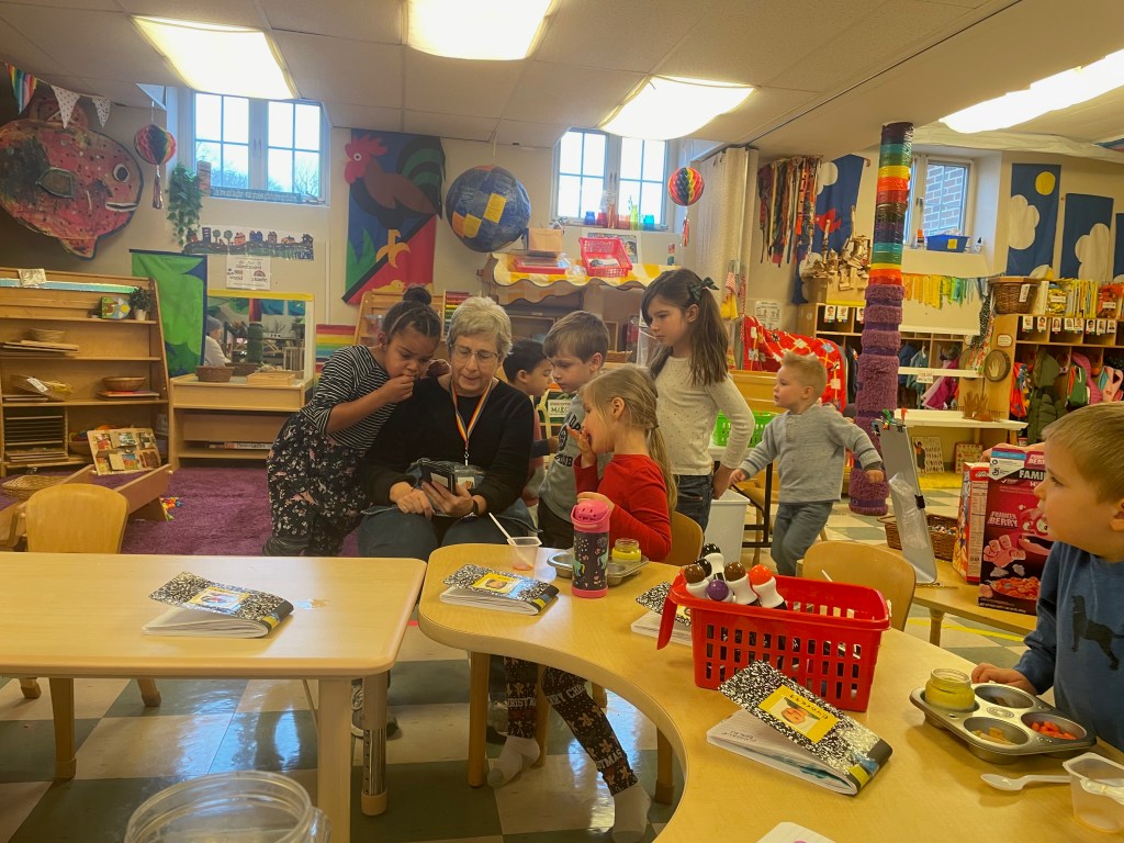 Then Grandma Bonnie brought out all of the leftover cereal and cracker boxes. The snack store was very busy with children, choosing what they wanted more of. During Snack Time, Ms Brenda checked the weather to see if it was raining.