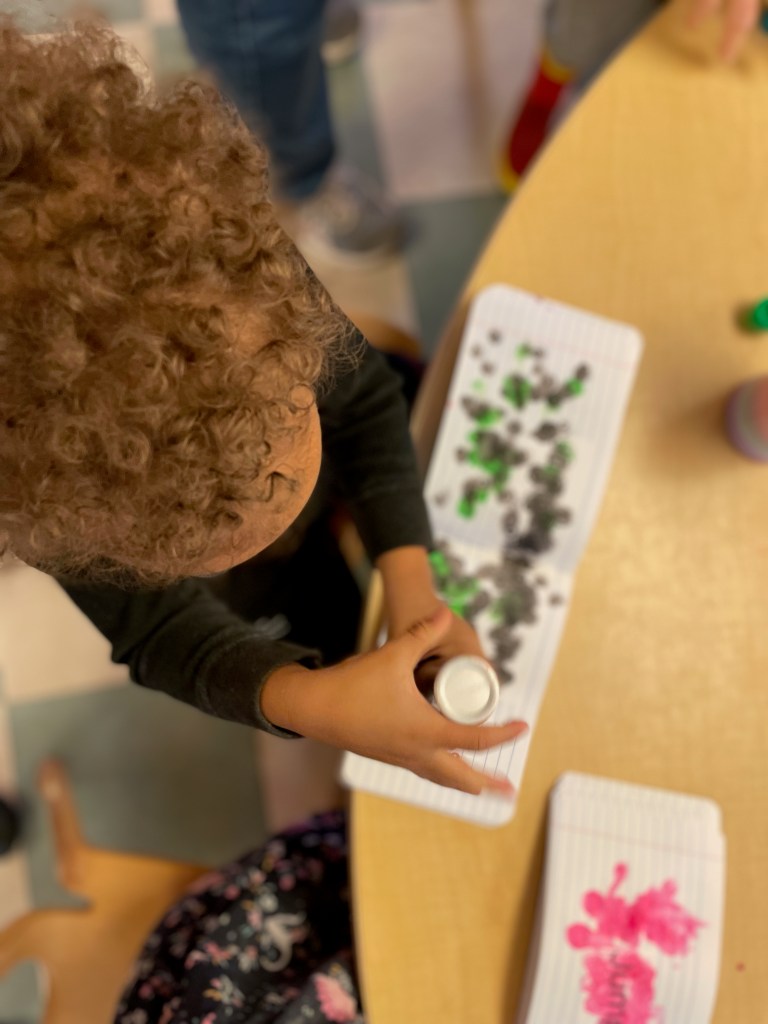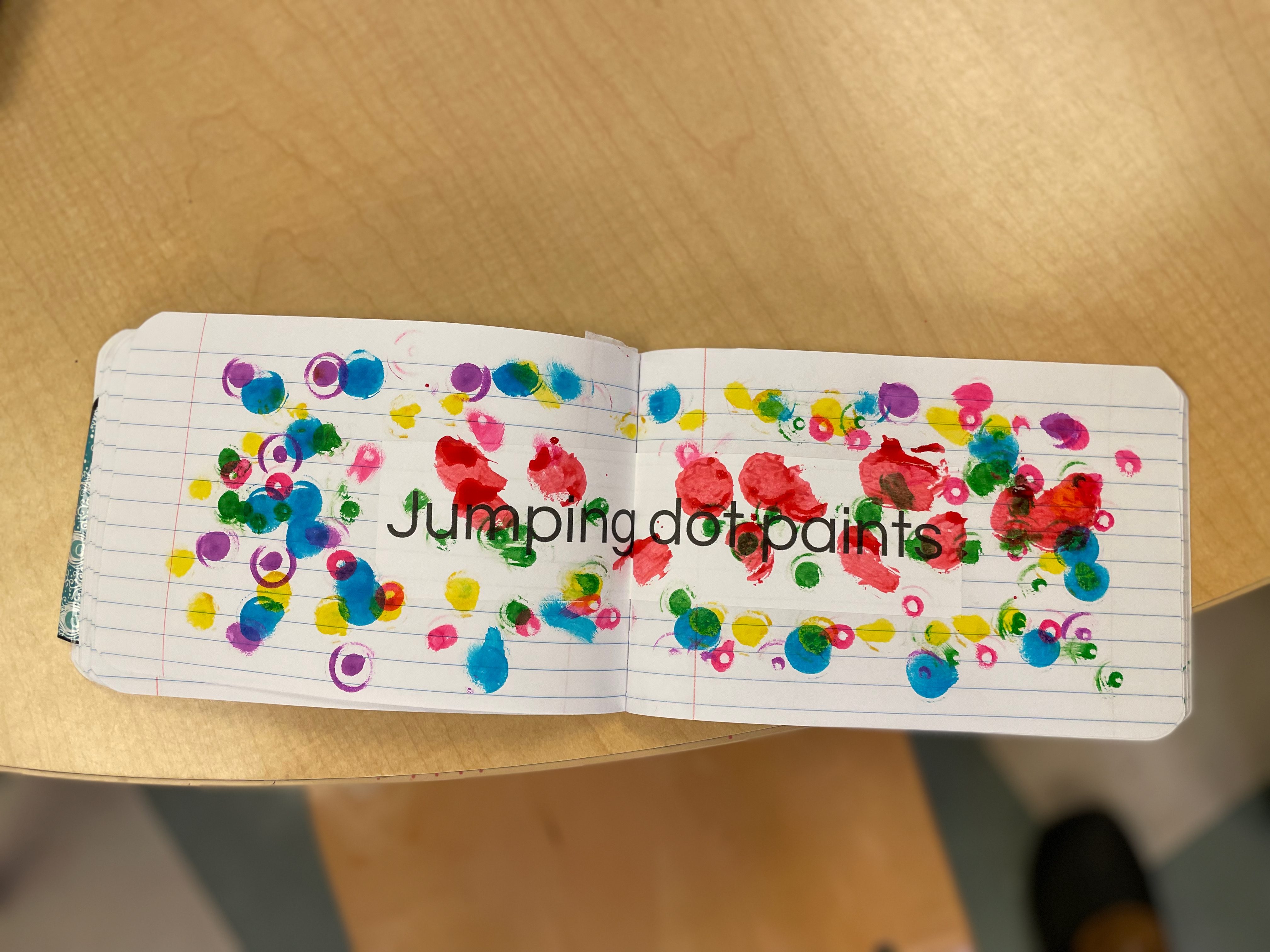 We looked through the journal work from yesterday’s class and noticed what colors they chose before we went to the big table to do our own jumping dot paint work. Somebody might have thought that we were hammering with all of the pounding sound!