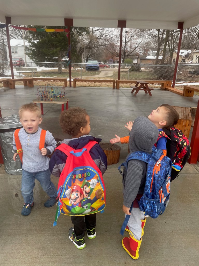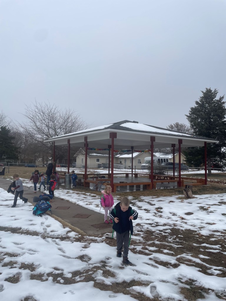 After reading The Mitten Mystery, we went outside to check on the snow. We could see puddles and drops of snow melting off of our pavilion roof. We also found tracks from animals and people. The most noticeable difference: the parking lot was clear!