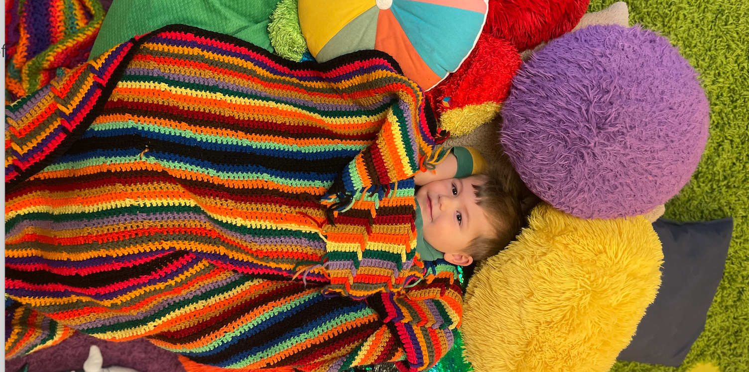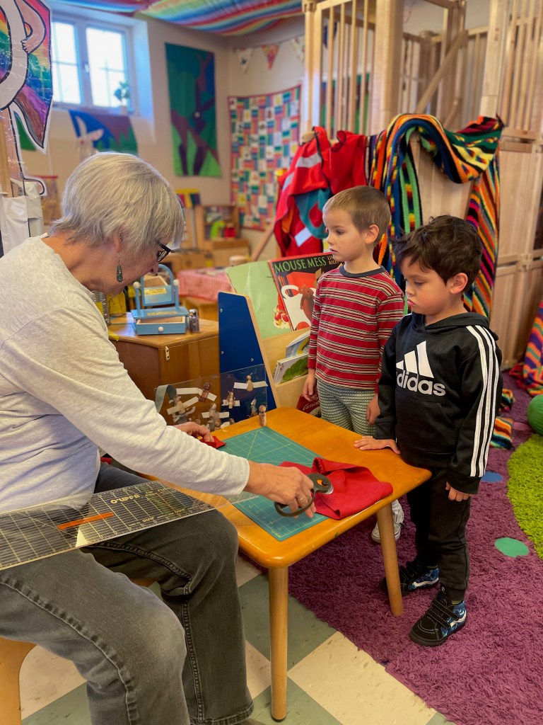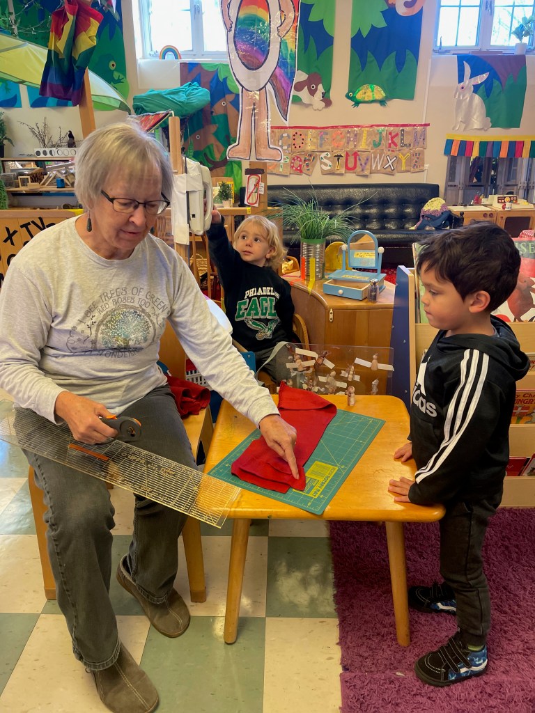 Grandma Vicki used her special sewing supplies from home to cut the pieces of blanket for us.