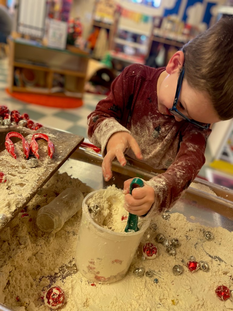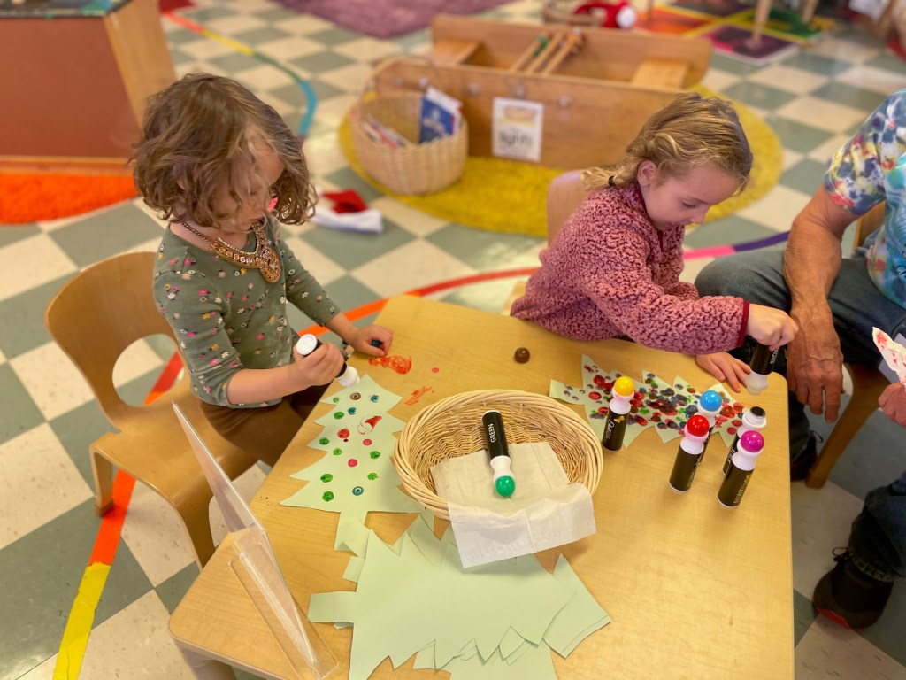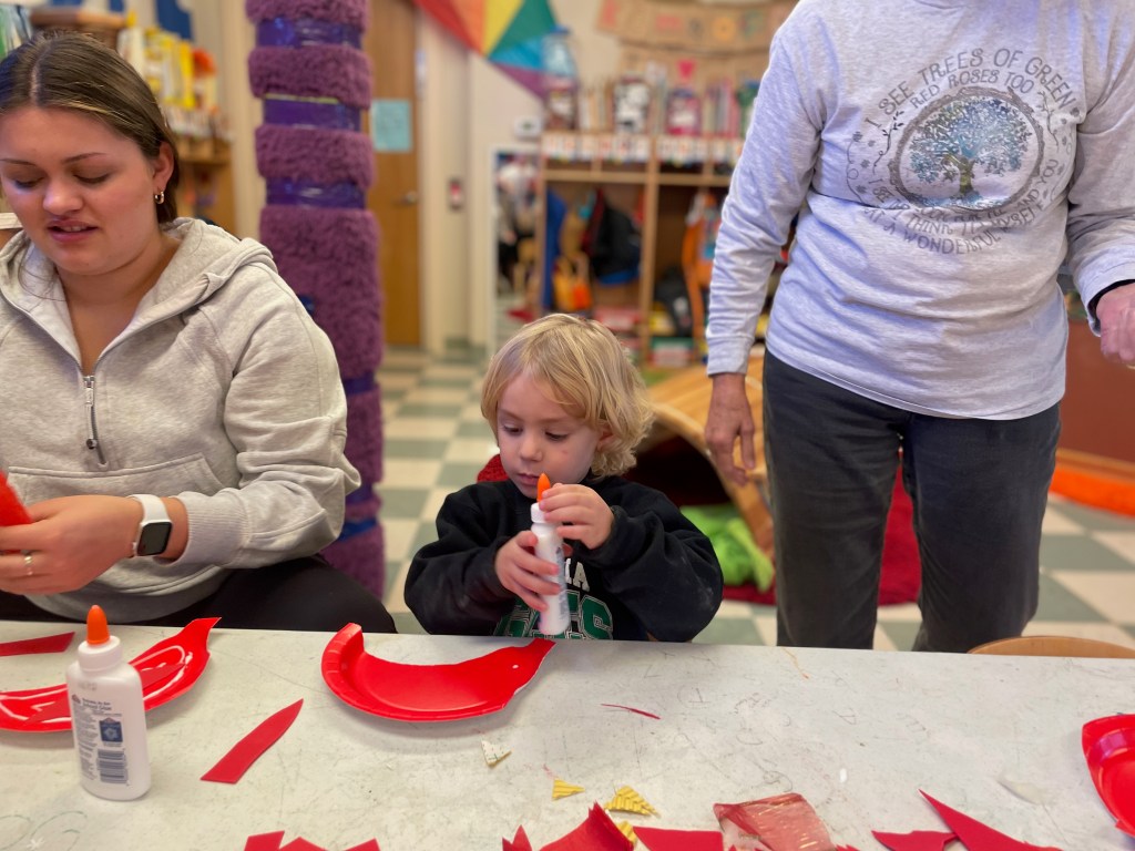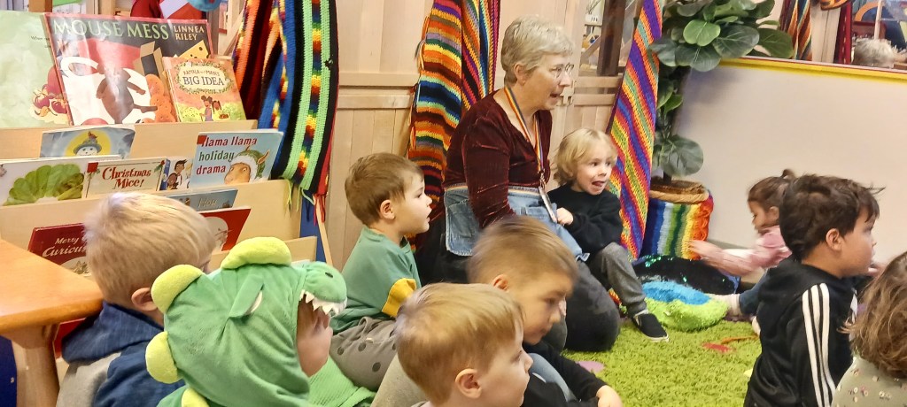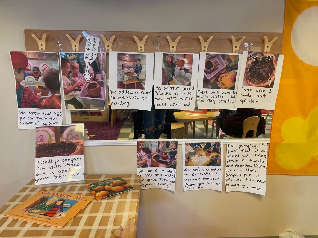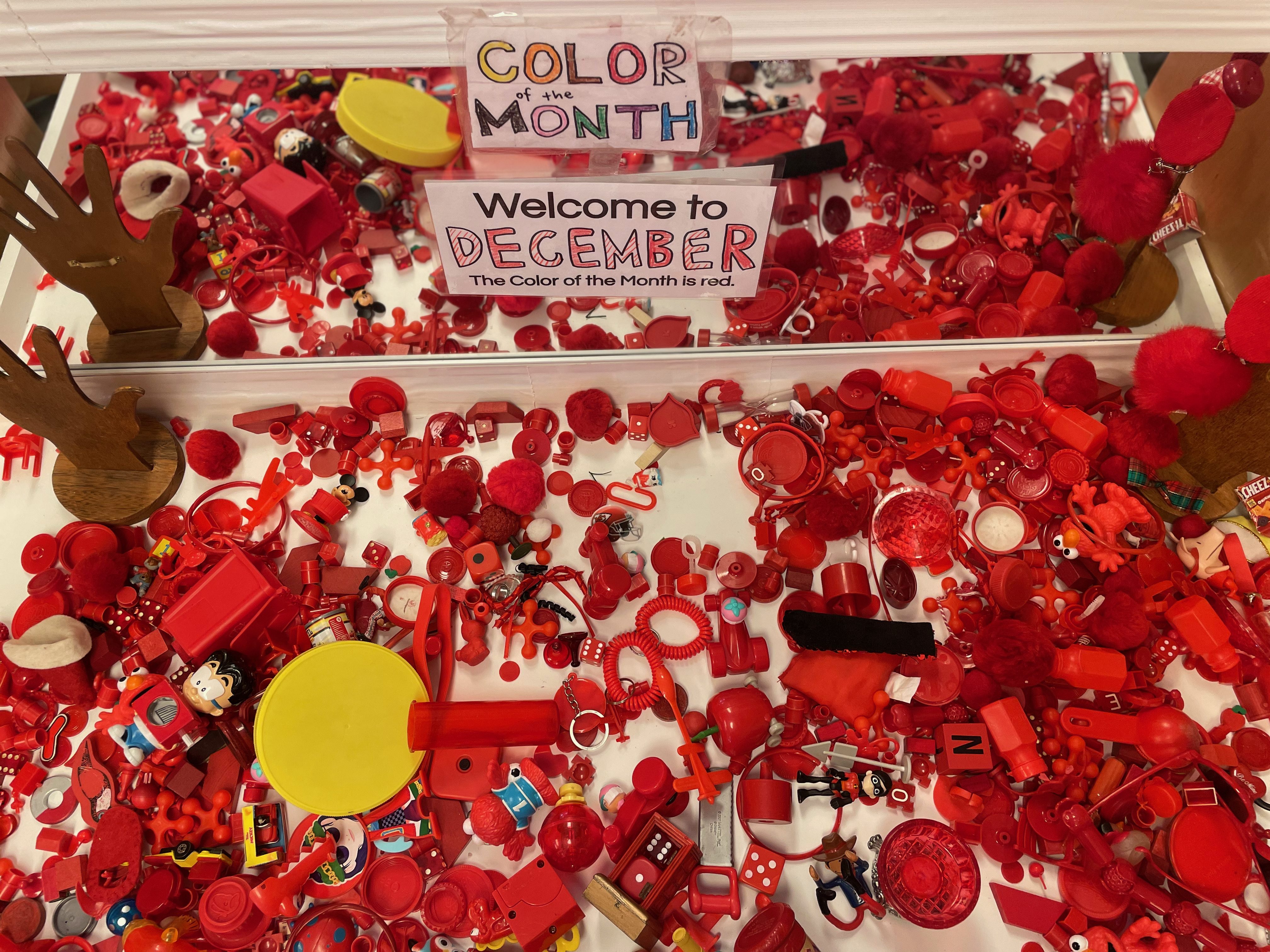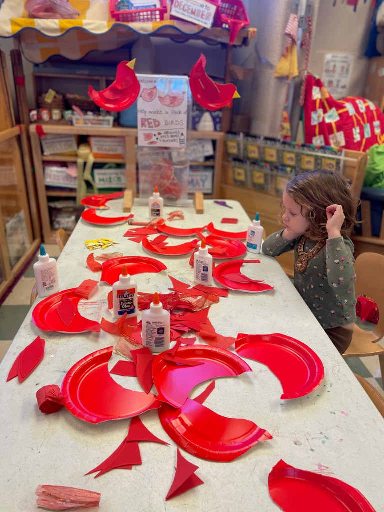 Our Monday “Red Day” Class welcomed December with a new color of the month, listening to Raffi sing Christmas songs, making ornaments, adding wings and beaks to red birds and more. We also took time to observe our memorial for the pumpkin plant that died last week.