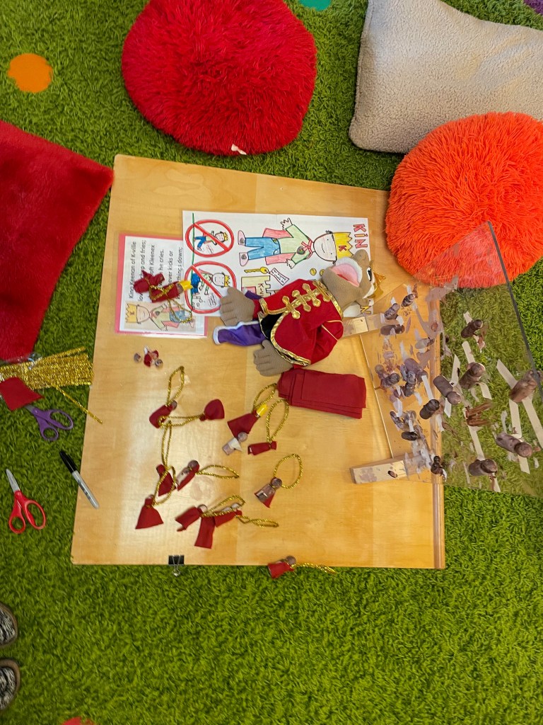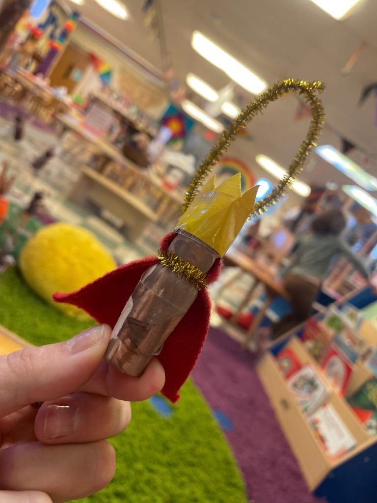 All of the dolls we painted last week are now being either wrapped in a blanket or have a cape put on them. Ms Kristin will get the crowns on soon!