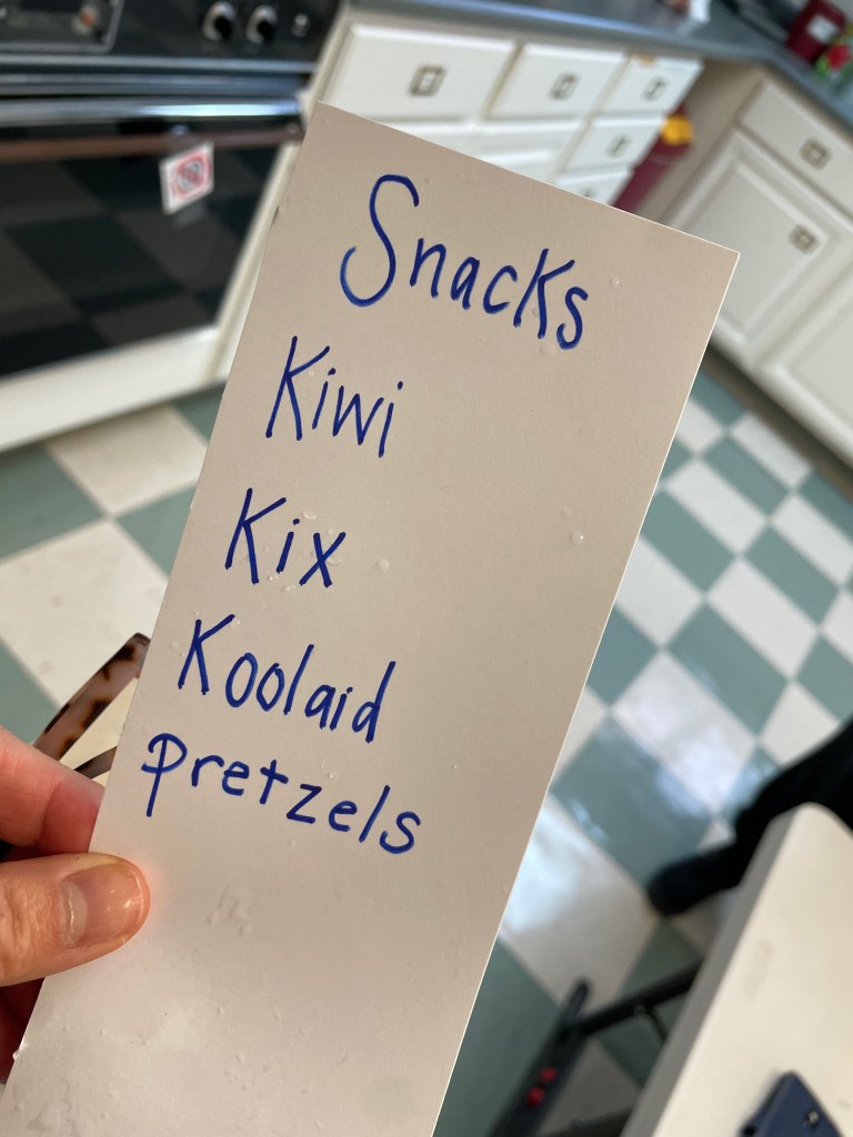 Kix cereal, kiwi and Kool-Aid! Rex also brought pretzels. It was determined that the kiwi tasted like a sour strawberry. A spot on description I had never thought of! Thank you Rex!