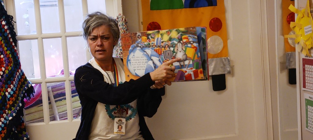 Santa! Here’s a movie of us watching him (including the part where Ms Kristin forgot to stop the video). When he reached the bottom we left to get our coats and backpacks on!