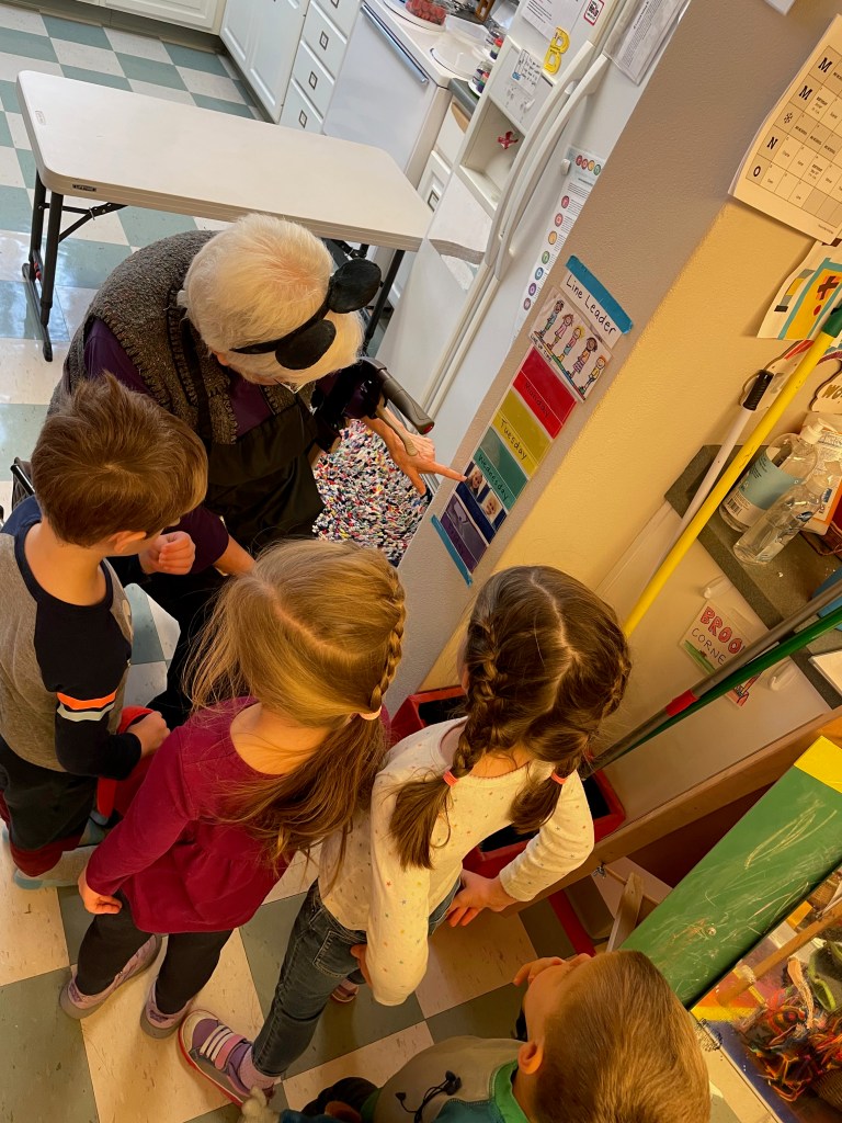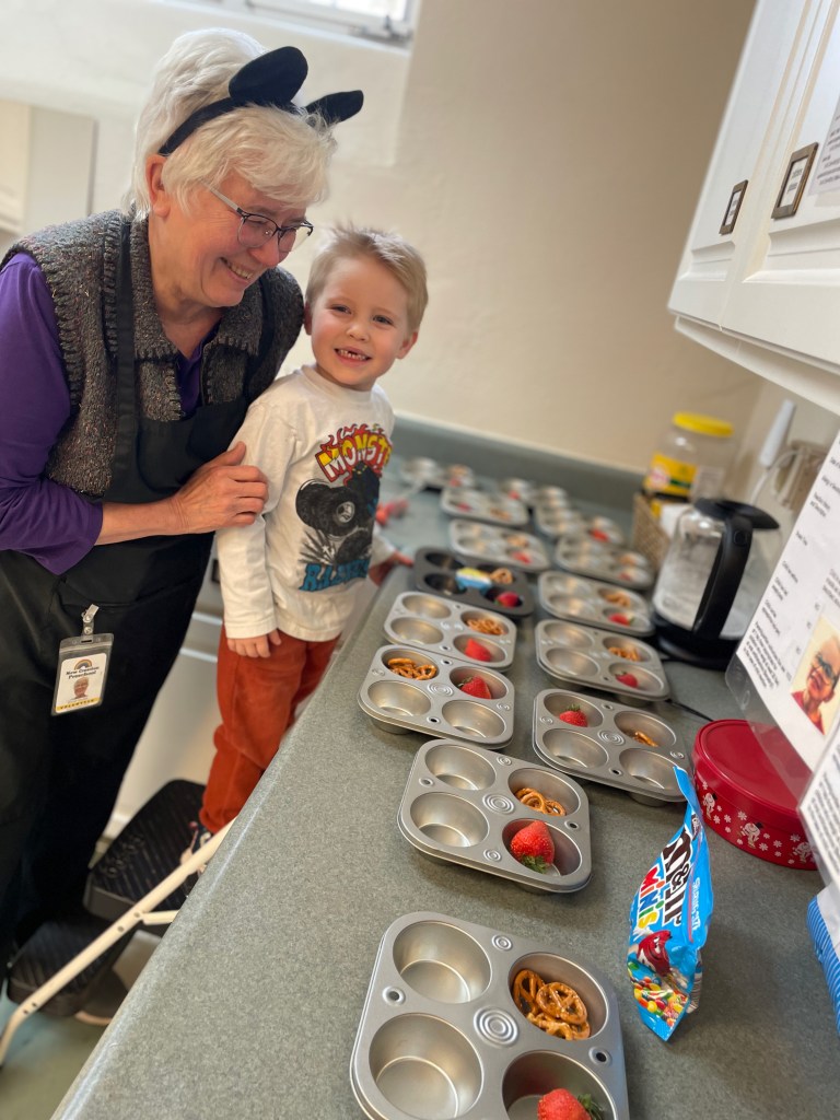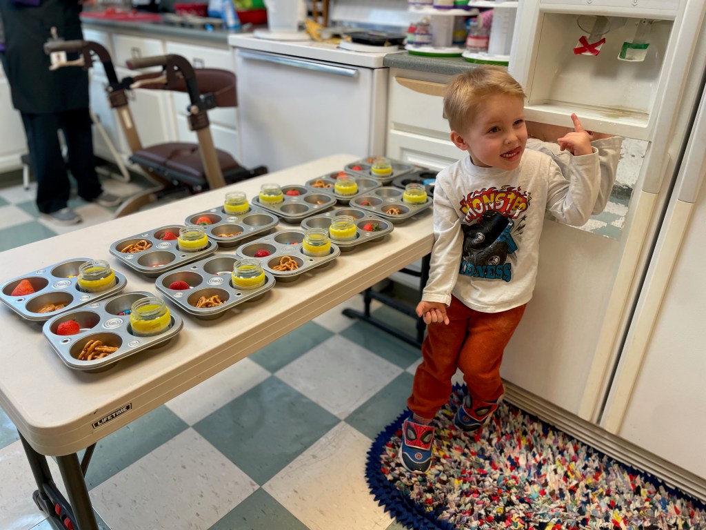 One of our Helper friends was gone today so she’ll get a turn next time. The other helper was quite busy and very happy to help. Grandma Bonnie got a communion cup out to use as a scooper for the mini M&Ms. I’m excited to tell church about that on Sunday!