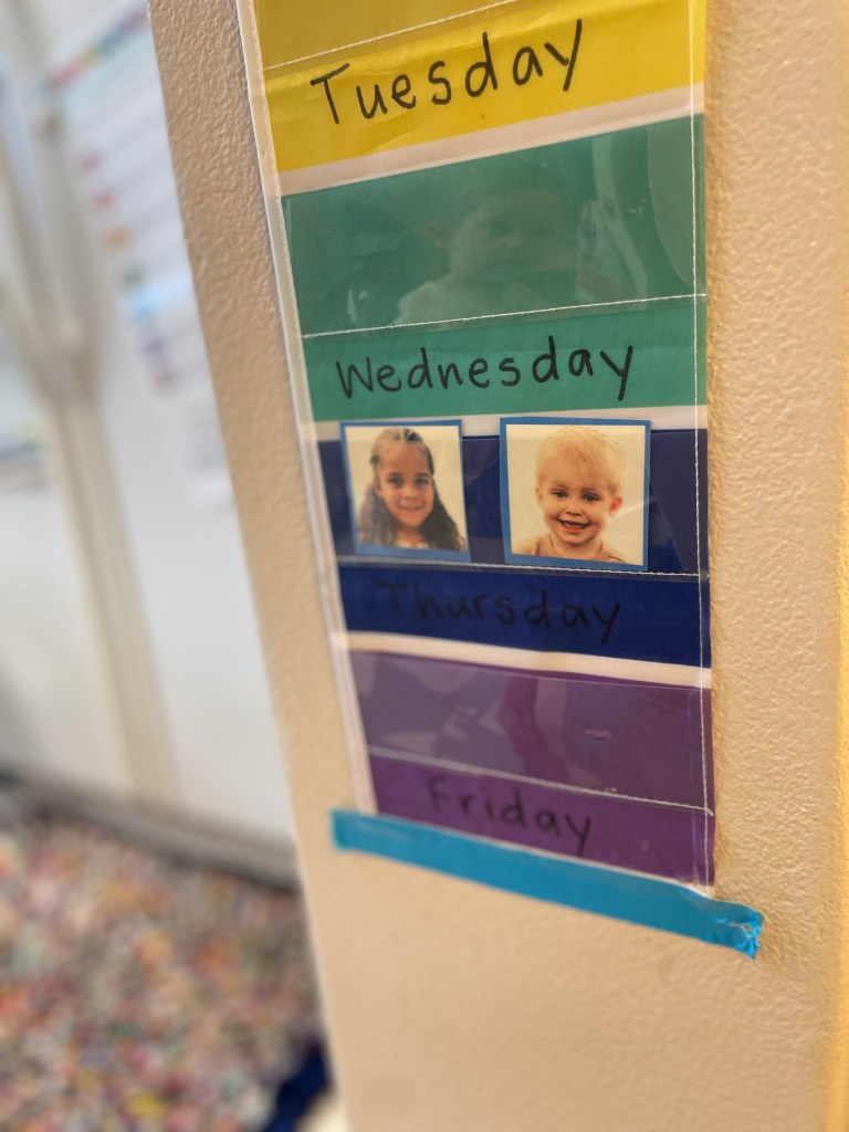 There are pictures on the helper chart. This is new! Those people can help Grandma Bonnie get snack ready and will serve as Line Leaders. Everyone’s picture will get there at some point.