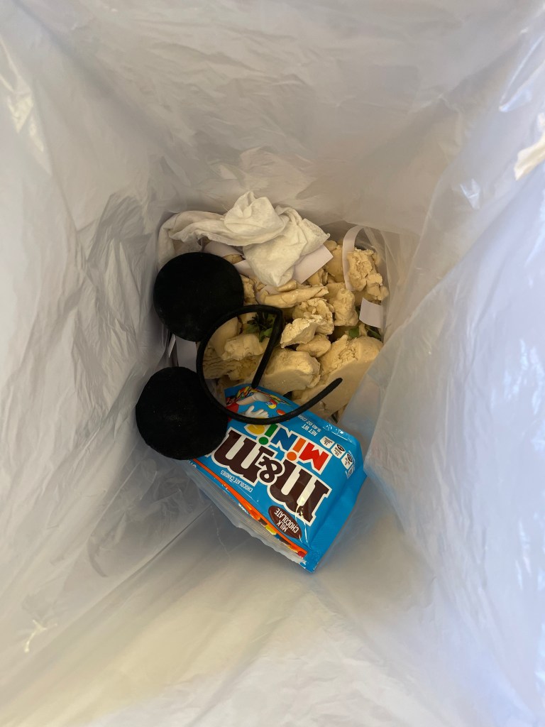 Why was there all the play dough clay, mouse ears and a bag of M&Ms in the garbage can?