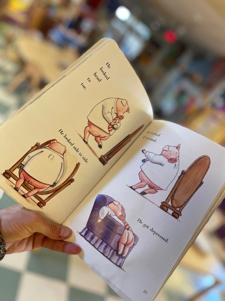 We read a chapter about Poppleton, who felt sad looking in the mirror at himself. This was after someone said he was “too big.” Poppleton got some perspective and reassurance from a good friend of his and felt proud to be himself (in a new coat).