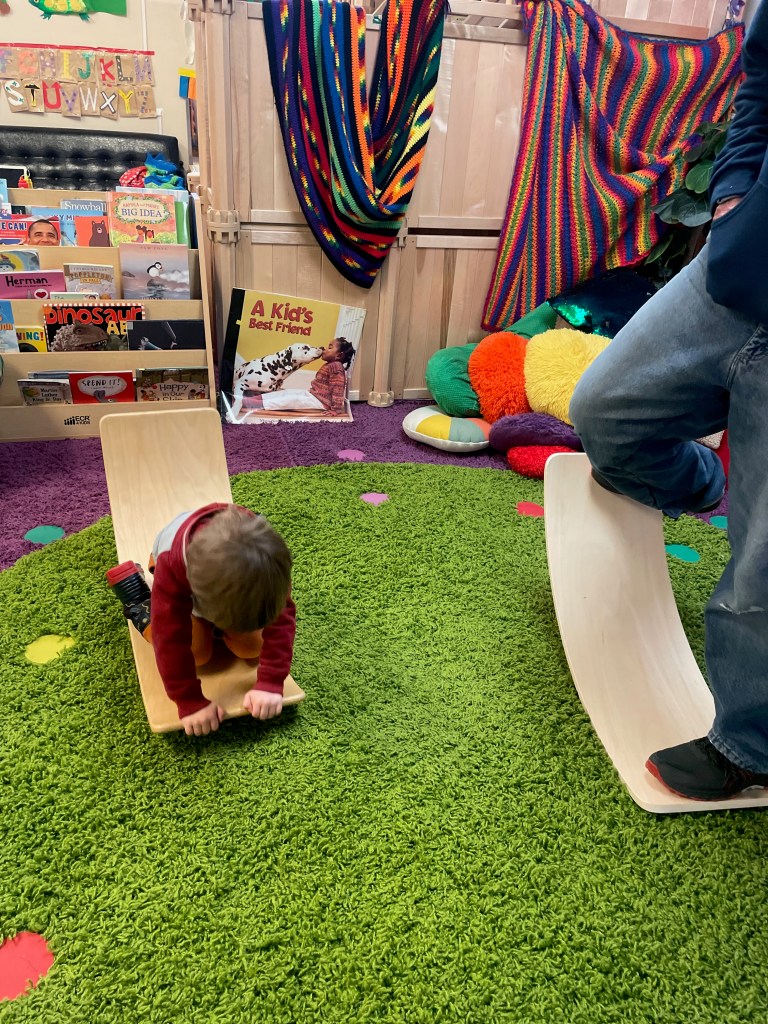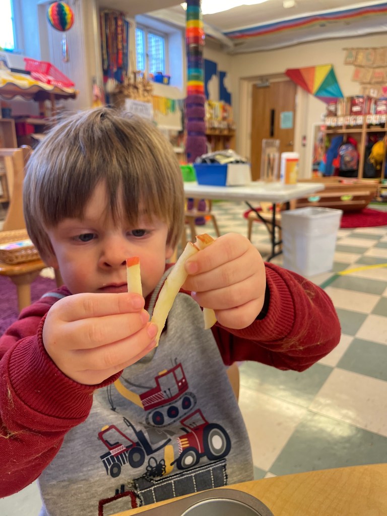 One of Henry G’s chicken flingers from Show and Tell! Since most friends were still finishing snack, there was a big audience and a lot of giggling about this today. We waited for awhile to see if it would fall down on its own but it never did so Ms Kristin was a Chicken Rescuer.