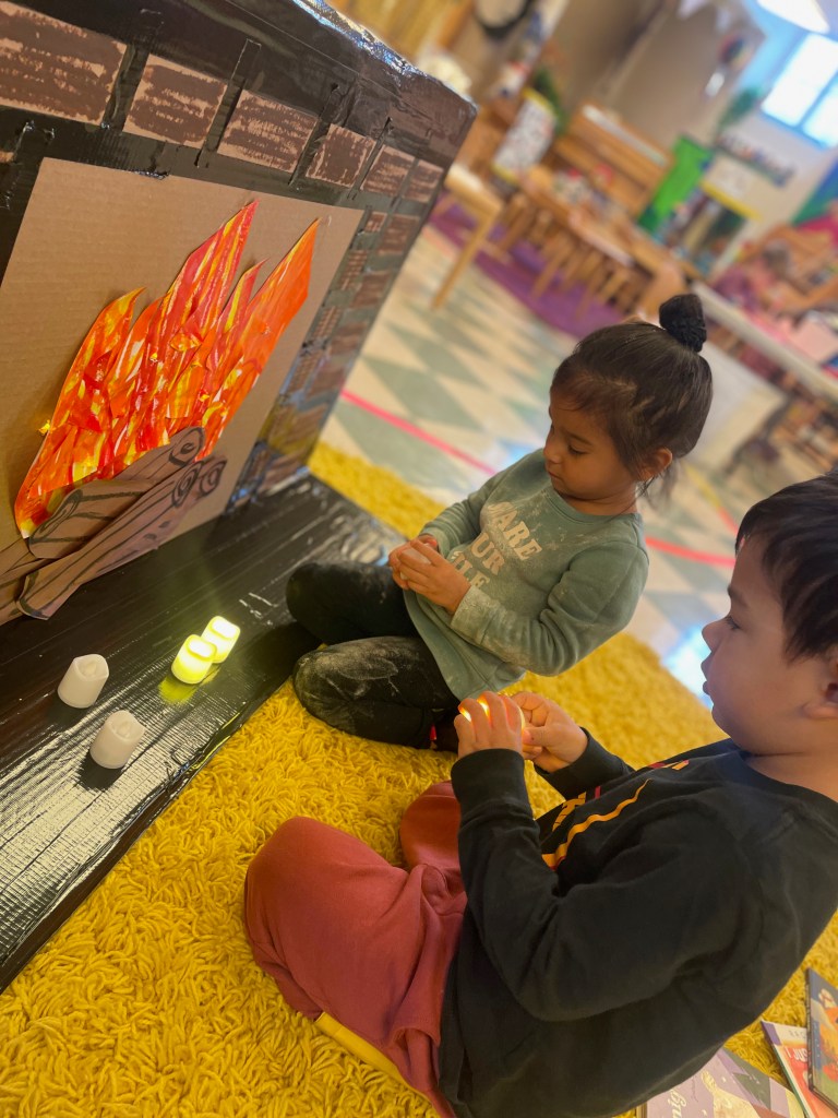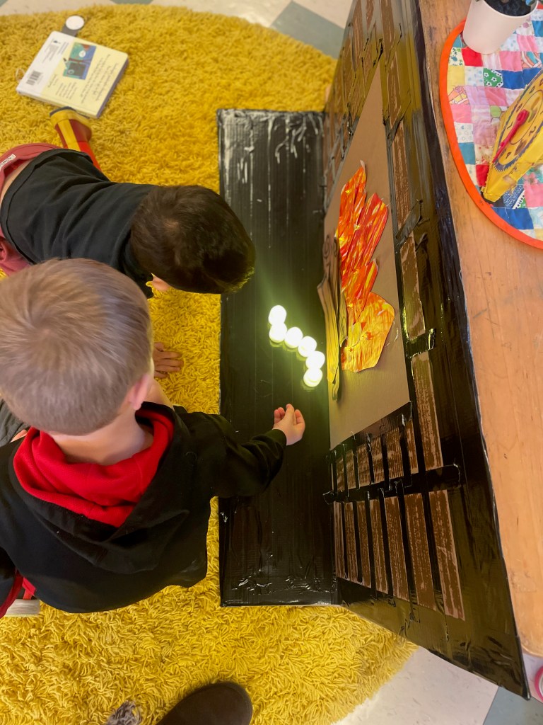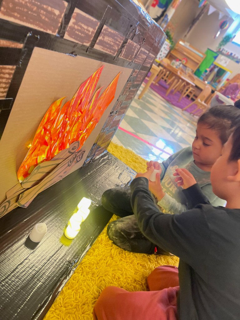 We made it today out of cardboard, tape, paint and battery lights. The handy thing about this fireplace is, it can move around the room. It even came to Show and Tell with us!