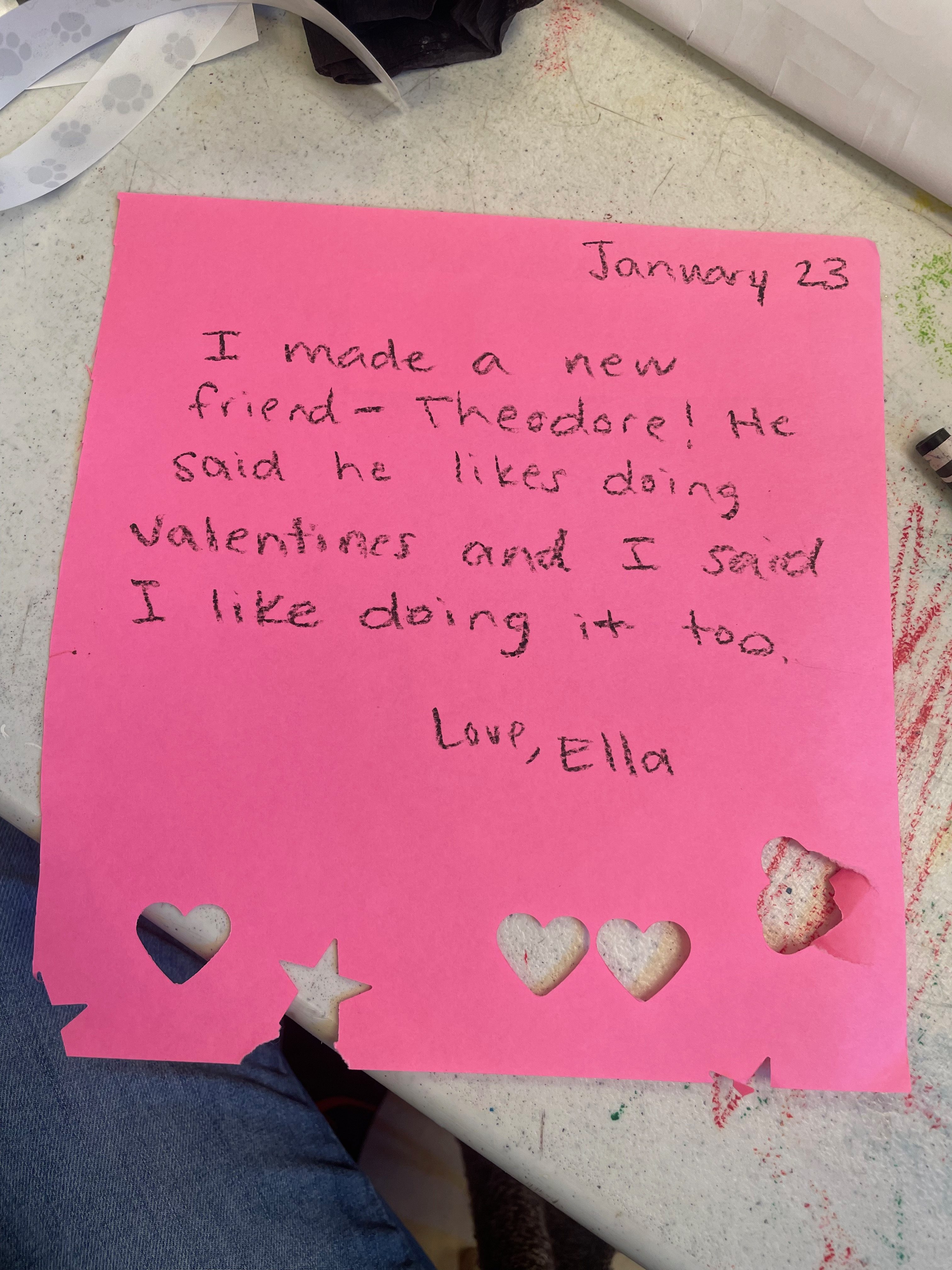 Today a new friendship was formed at the impromptu Valentine and Brown Paper Cutting Table.