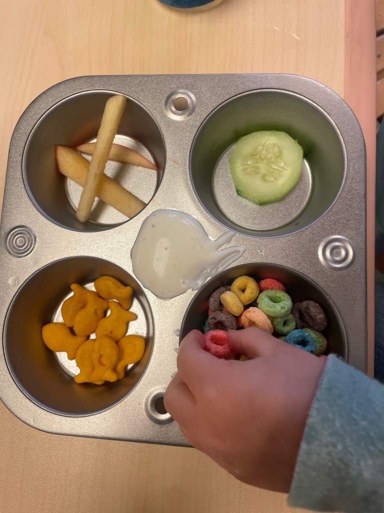 To Ms Kristin or Ms Brenda depending on what food was desired with all of us sitting at the table together. Ms Kristin had the cucumbers, ranch and goldfish. Ms Brenda had the Froot Loops.