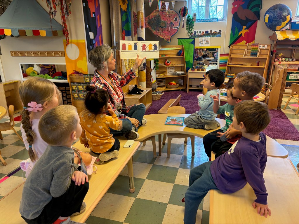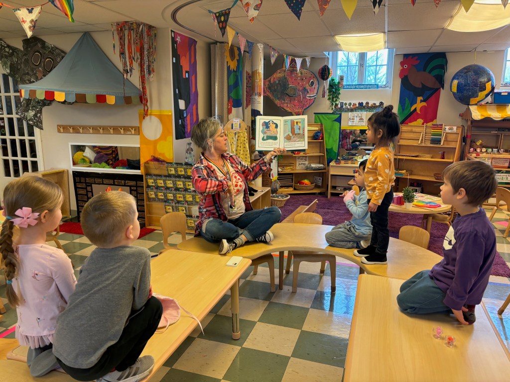 Ms Kristin had so many favorite books this week that she decided to read during play time. She also said that yes, you could sit on the big table to listen (the novelty of this brought some friends closer sooner). Eventually everyone was there.