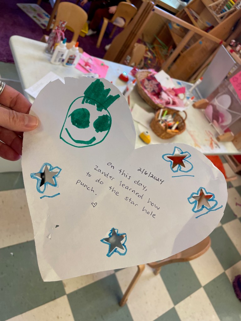 Whenever I talk about the hole punches we have, there are sure to be some heads darting my way. I’m quick to say that I’m talking about a tool that makes holes in paper. Using a hole punch is not an easy task for young children to master and we’ve got another one who did!