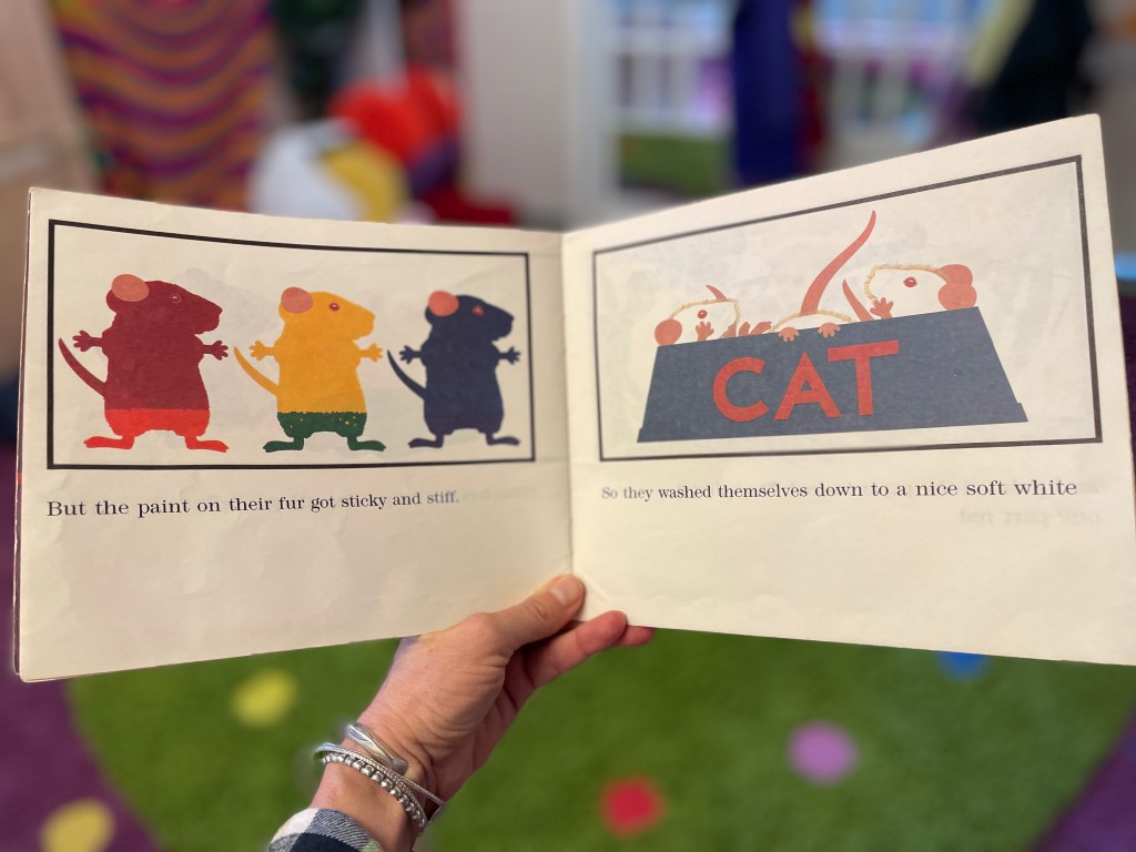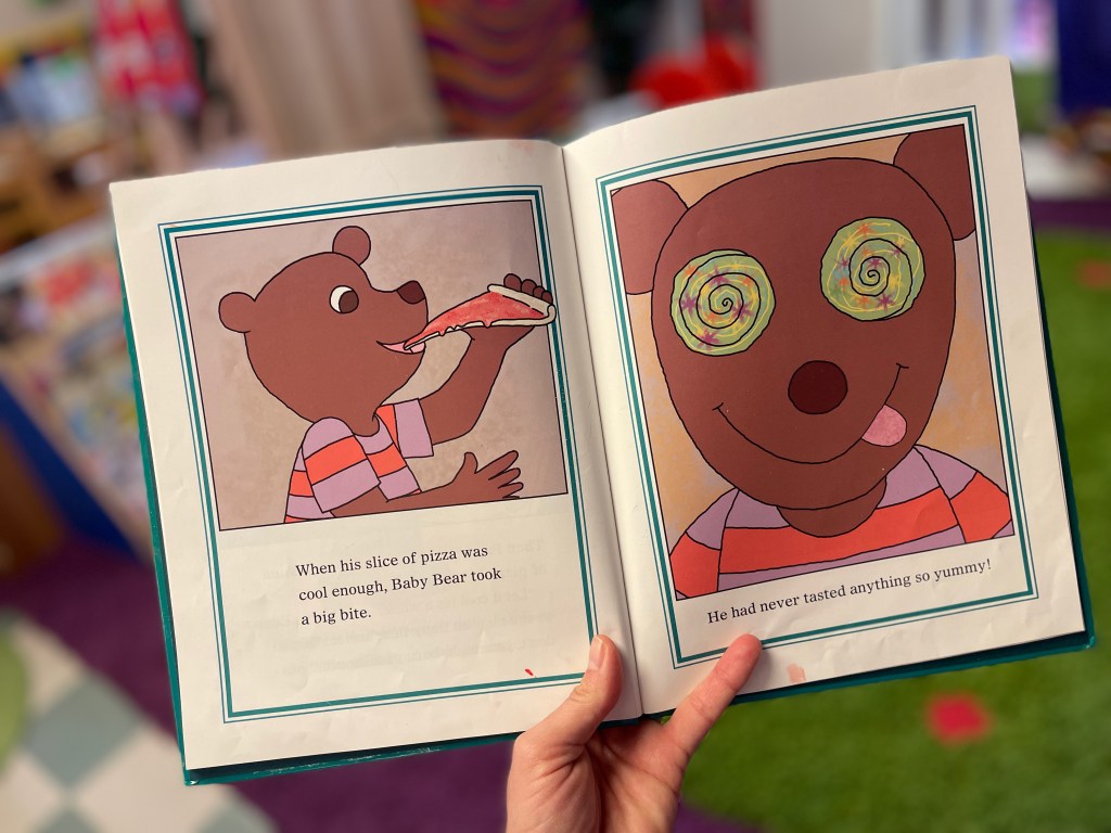 A couple of questions your children will be able to respond to: where did the mice go to wash off the paint and did Baby Bear like the pizza?
