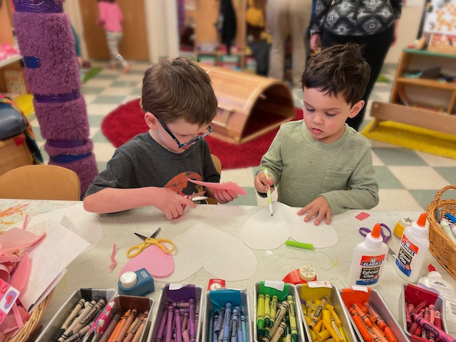 There are always supplies available at the Project Table. Today we had friends punching holes, making paper and plastic pigs, cutting pipe cleaners and using pink tape.