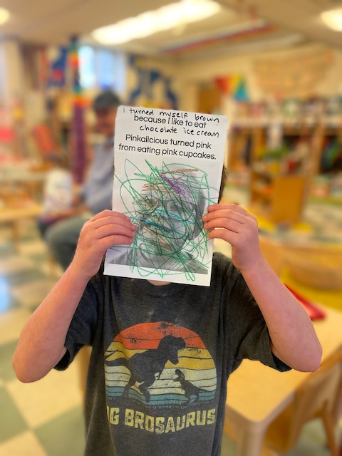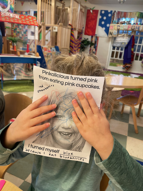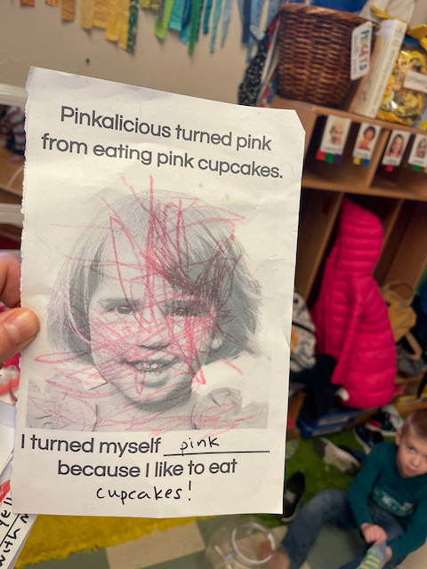 Pinkalicious is a book character whose skin turns pink after she eats too many pink cupcakes. This is not a true story. We thought of foods we like to eat and colored our own faces colors to represent them.