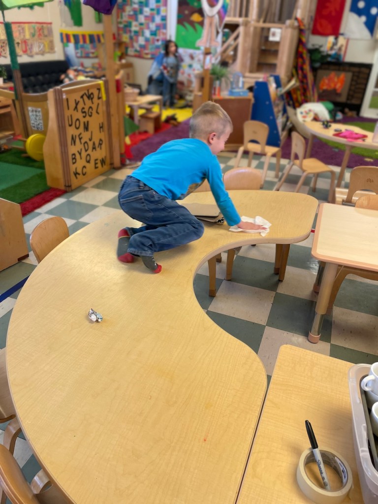 Ms Kristin said it looked so clean that it looked like no one had preschool all day. Then a friend said it was so clean it looked like we didn’t have school for a week! These children were on the tables and under the tables with wipes. They were sweeping the floor (and table tops). The chalkboard even got cleaned! The Family Corner is as tidy as can be! Incredible work, friends!