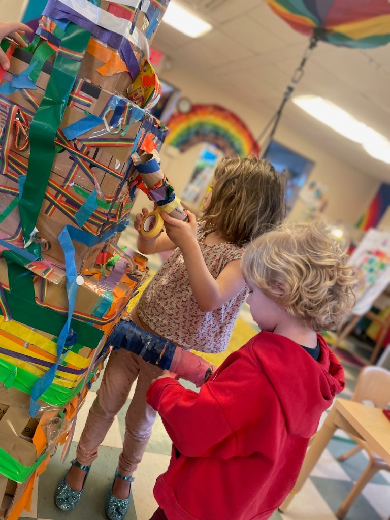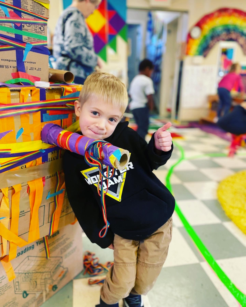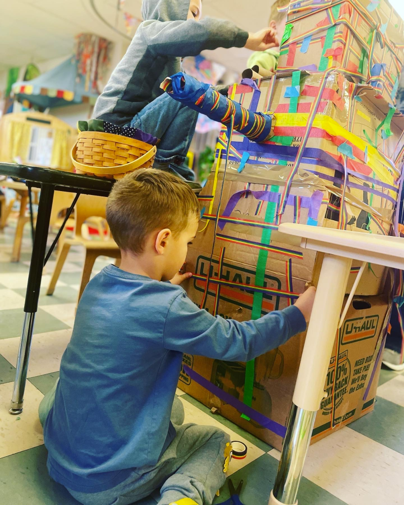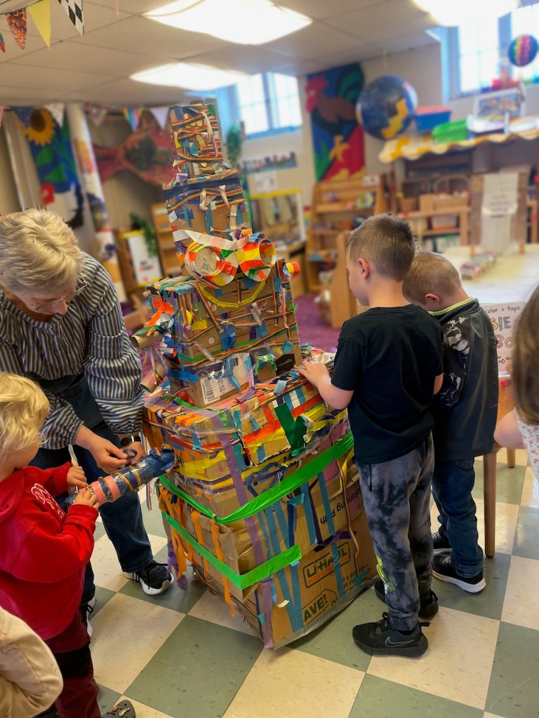 Once upon a time a group of children made a rainbow robot out of rectangle boxes to help collect our garbage. Then she went to church and helped take the offering. Then she got to come to preschool graduation. She’s been resting on a shelf for nine months until today.