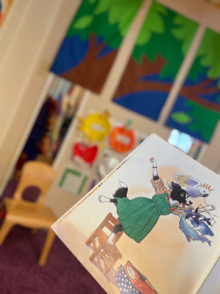 She needed to get a Golden Letter off of the ceiling. In our book Ms Bindergarten stands on a chair to hang a mobile which is what Ms Kristin copied (rather than the page where Ms Bindergarten stands on a chair and a block!).
