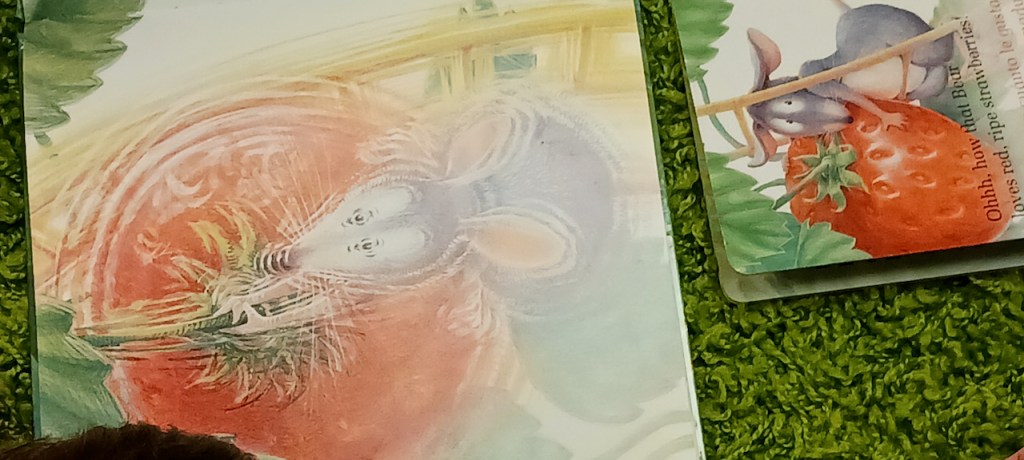 The mouse was scared the bear was going to come and eat the strawberry. We took notice of the fact that we never see the bear and we never hear the bear. All of the mouse’s fears were about ideas of what could happen. As someone who lives with anxiety, I am very familiar with this cycle!