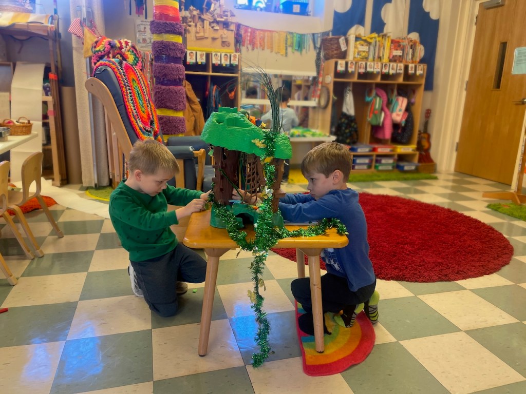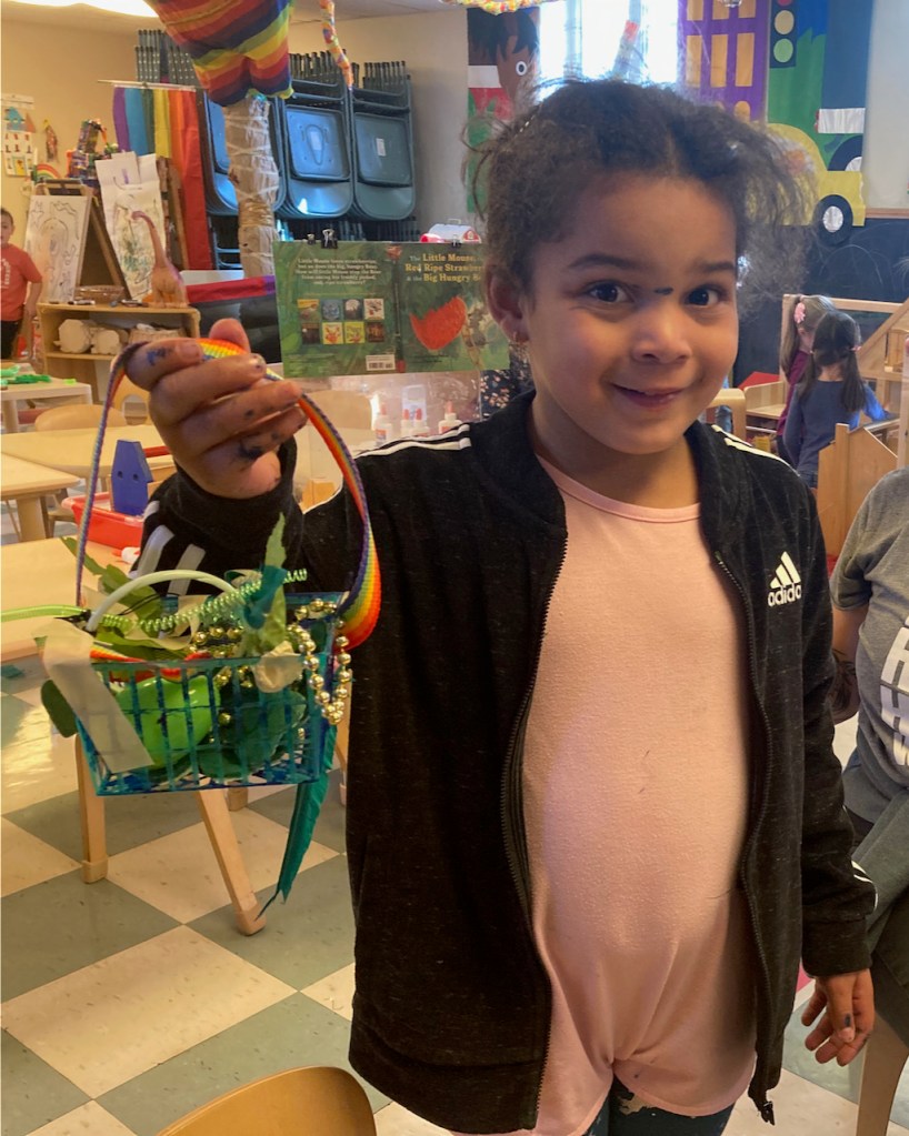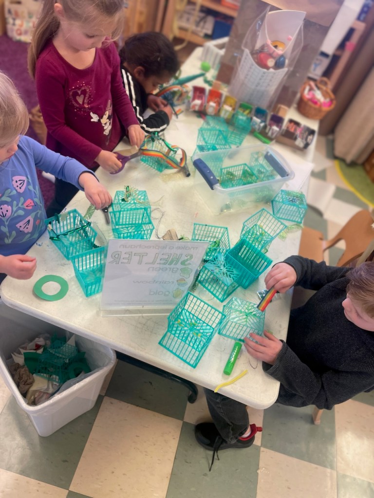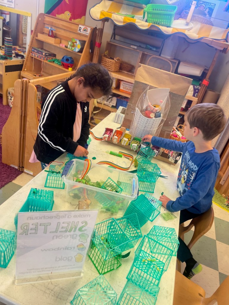 A former preschool family donated strawberry baskets for us and amazing creations were made. Some leprechaun shelters, some fancy baskets and some skyscrapers. They were very creative because glue doesn’t work for this so they had to use tape or string/wire/zip ties.