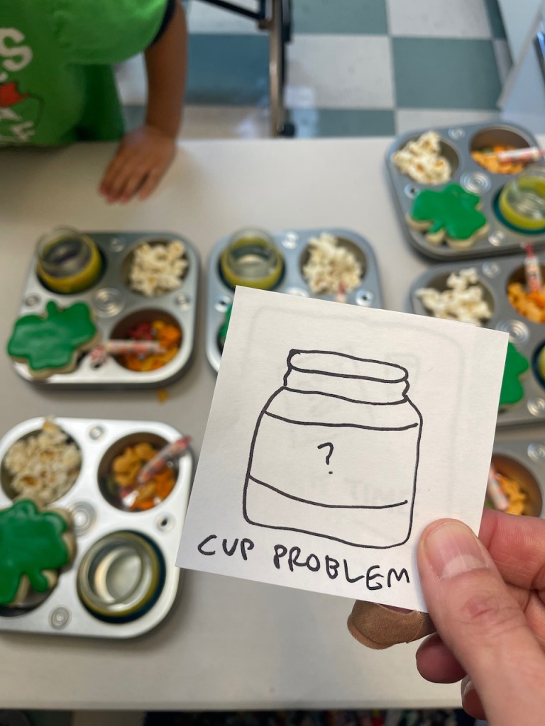 Once upon a time everyone had their own cup. They knew it was their cup because their name was taped on it. Then one day a teacher noticed that there was dirt stuck under the tape so another teacher took all the names off. Then when it was snack time, there was a cup problem.