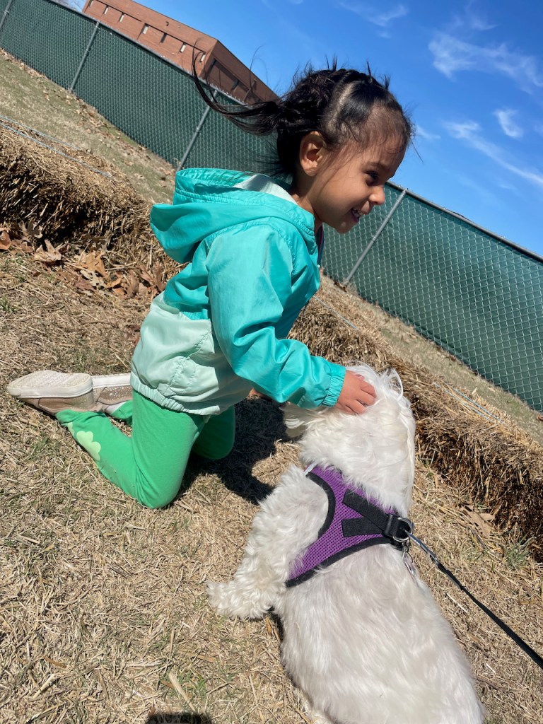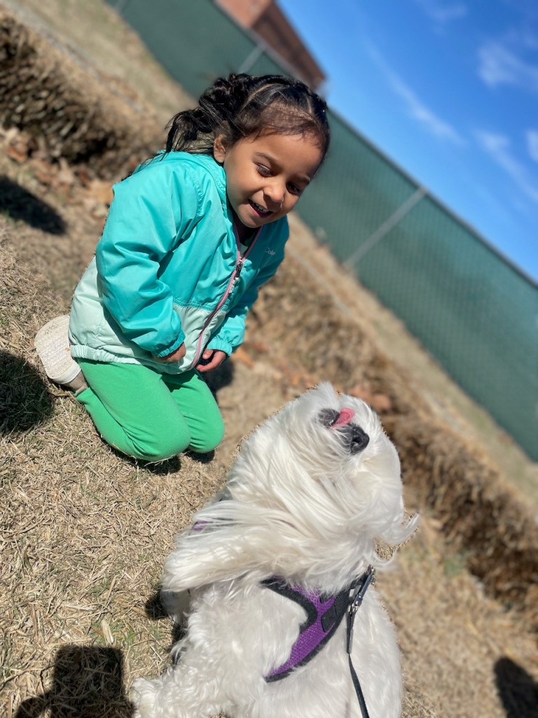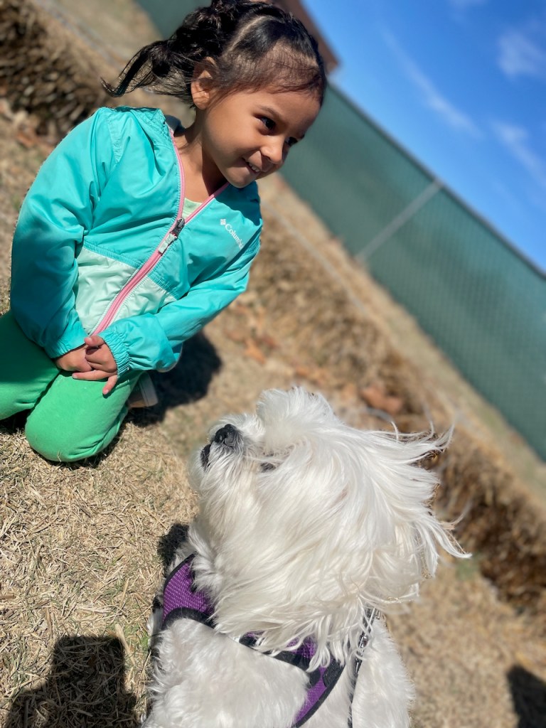 Everyone was very respectful of Lily and waited on the hay bales or behind the hay bales for Lily to come to us. Lily is a girl, almost 9 years old who eats kibble and sometimes eggs, drinks water, wears a purple harness, has a leash, sleeps in her bed or with Wilmer’s mom and dad, has a tongue and is very soft.
