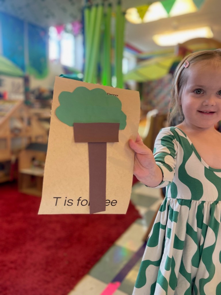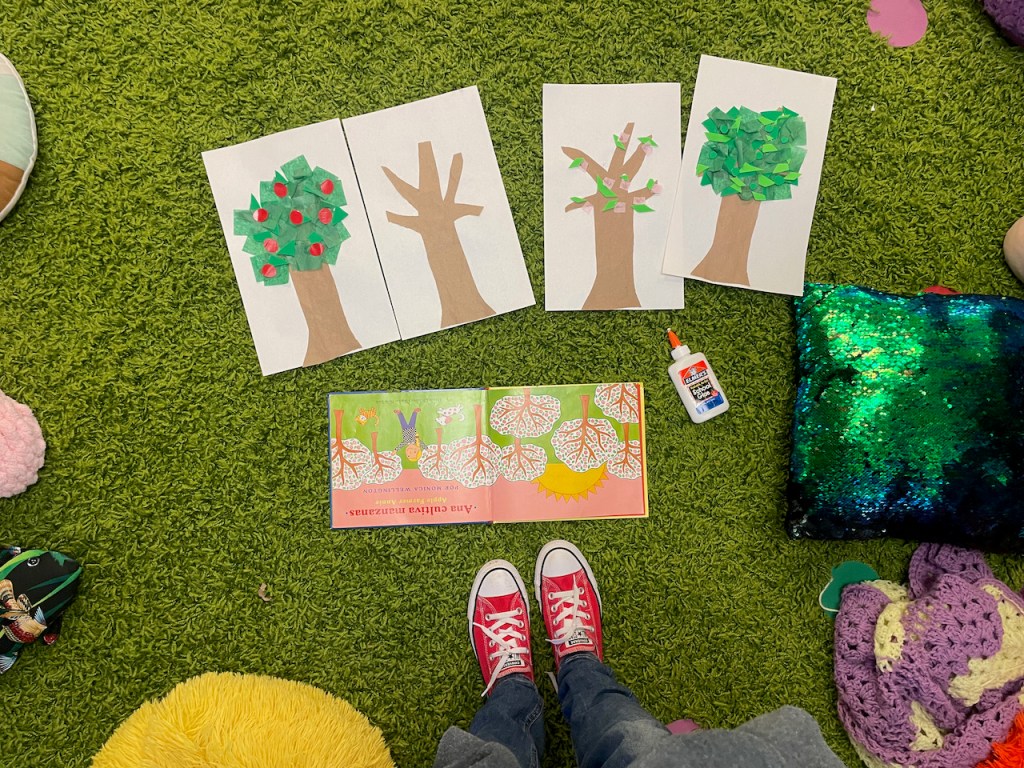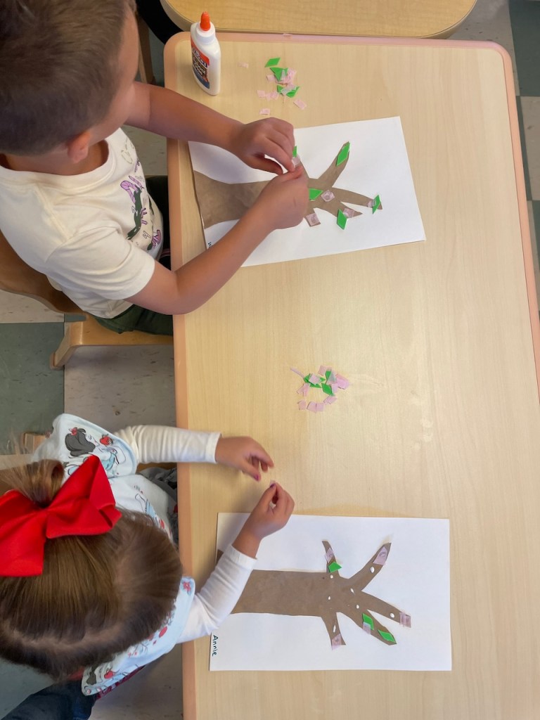 Apple blossom flowers! We looked at all the phases of an apple tree during Circle Time and compared them to our book from September about Apple Farmer Annie before making our own Spring trees.