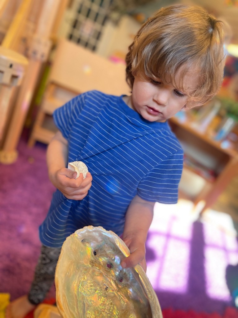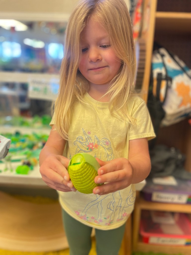 We did the telling part of Show and Tell on the steps inside, then did the showing part outside! When we went outside we found out that Henry had something in the teapot as well.