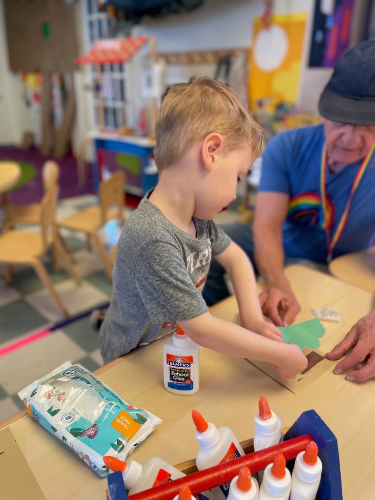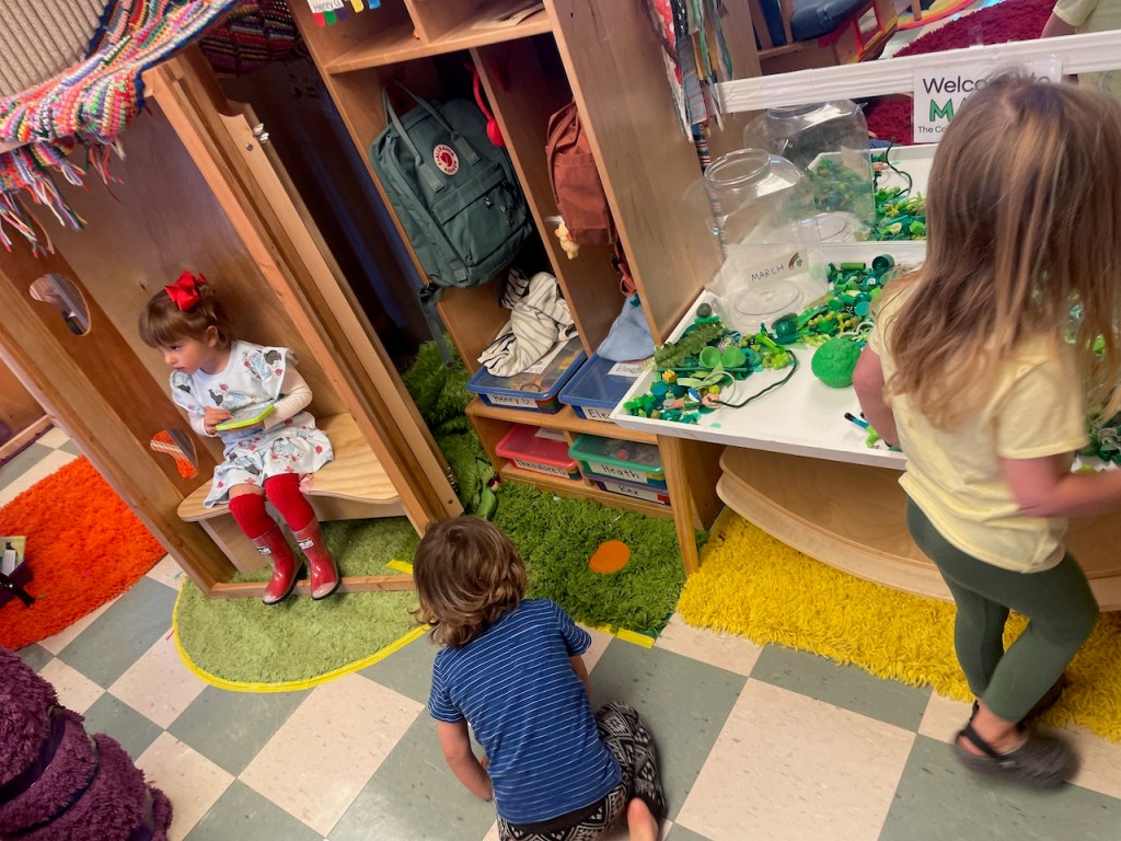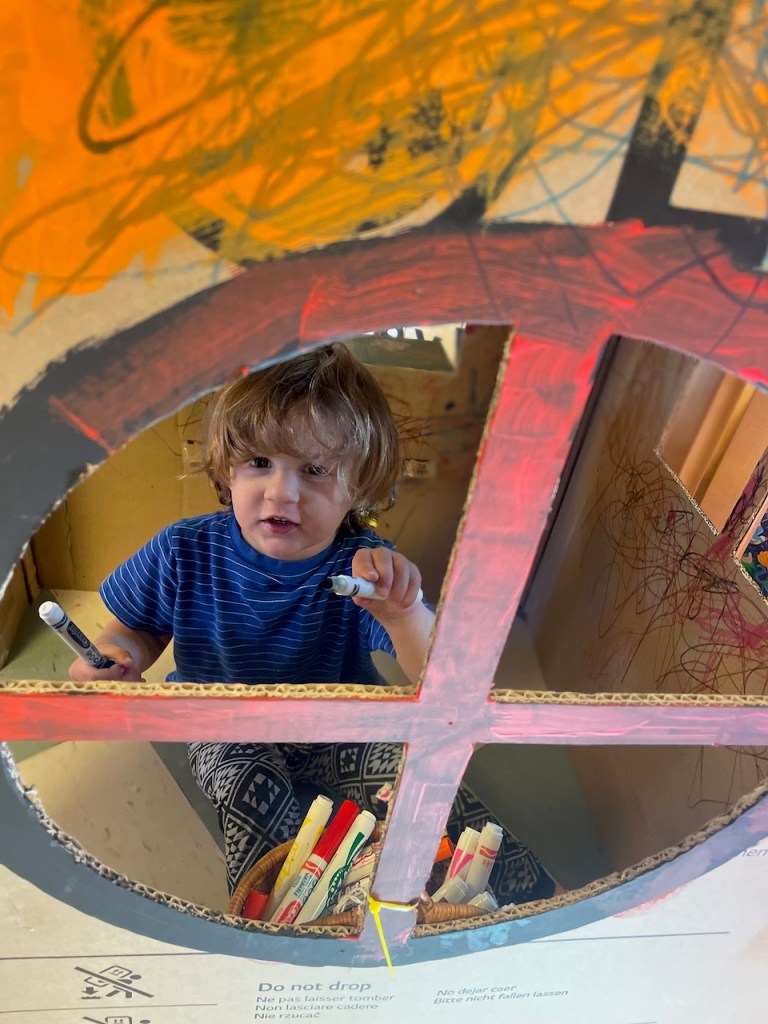 We were gifted a cardboard house from a former preschooler and church friend, Dominic. It has been so very busy and a bit like a clown car with how many friends can fit inside! This week we have markers inside so there is a lot of scribble work going on.