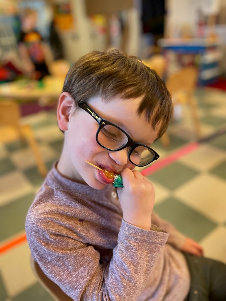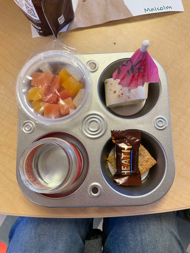 Malcolm and Max brought tropical fruit cups, turkey on tortillas and toffee filled chocolate bars. Thank you for the tasty treats!