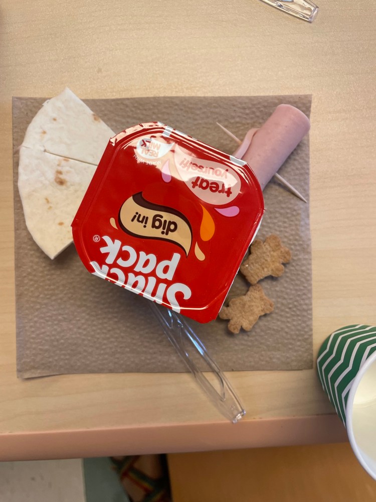 In addition to the turkey rolls held together by the toothpick, Jacob brought us tortilla triangles, Teddy Grahams and tapioca pudding! Jacob, we thank you very much!