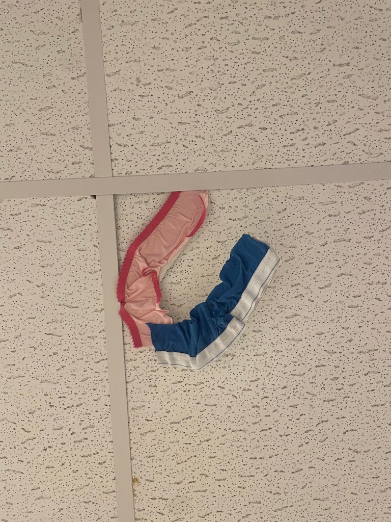 A long time ago Ms Kristin cut up some old underwear and glued it on a letter U shape. How silly.