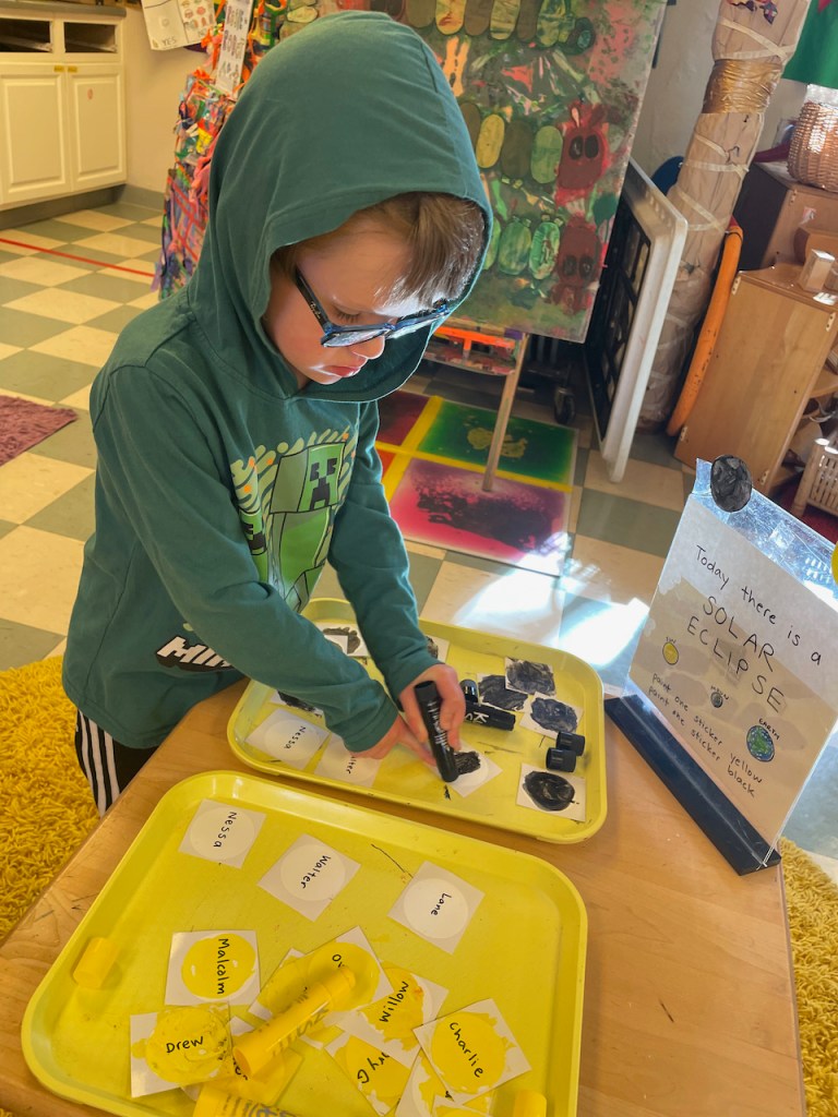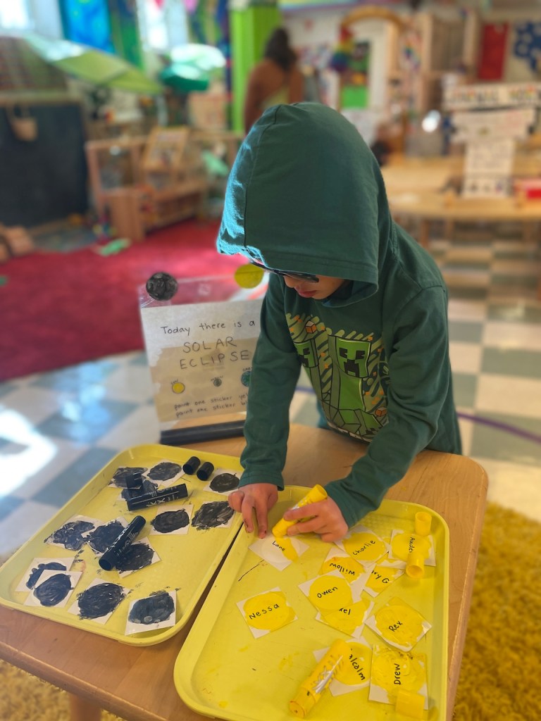 Just like the light sun and cardboard moon Ms Kristin showed at Circle Time, the moon covers the sun! Show your family how you can do it!