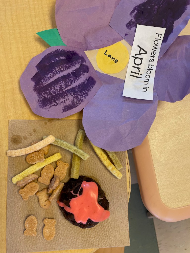 Chocolate cakes and frosting! Thank you, Owen for a very wonderful snack. We also had the table set with vanilla cupcake goldfish and Veggie Straws.