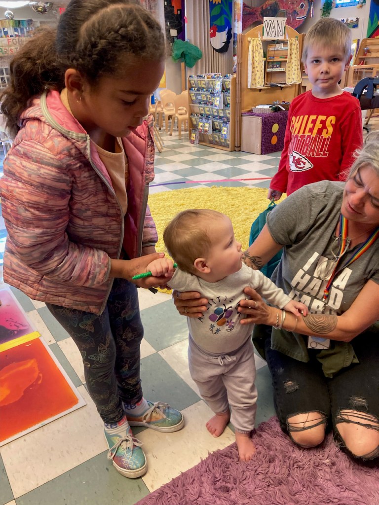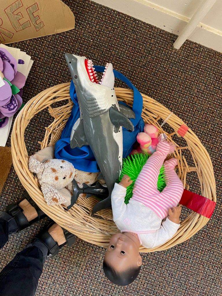 We turned the shopping cart into a double stroller. We also moved the baby things to a new corner along with real diapers. We’ve got a lot of wonderful caregivers in the making.