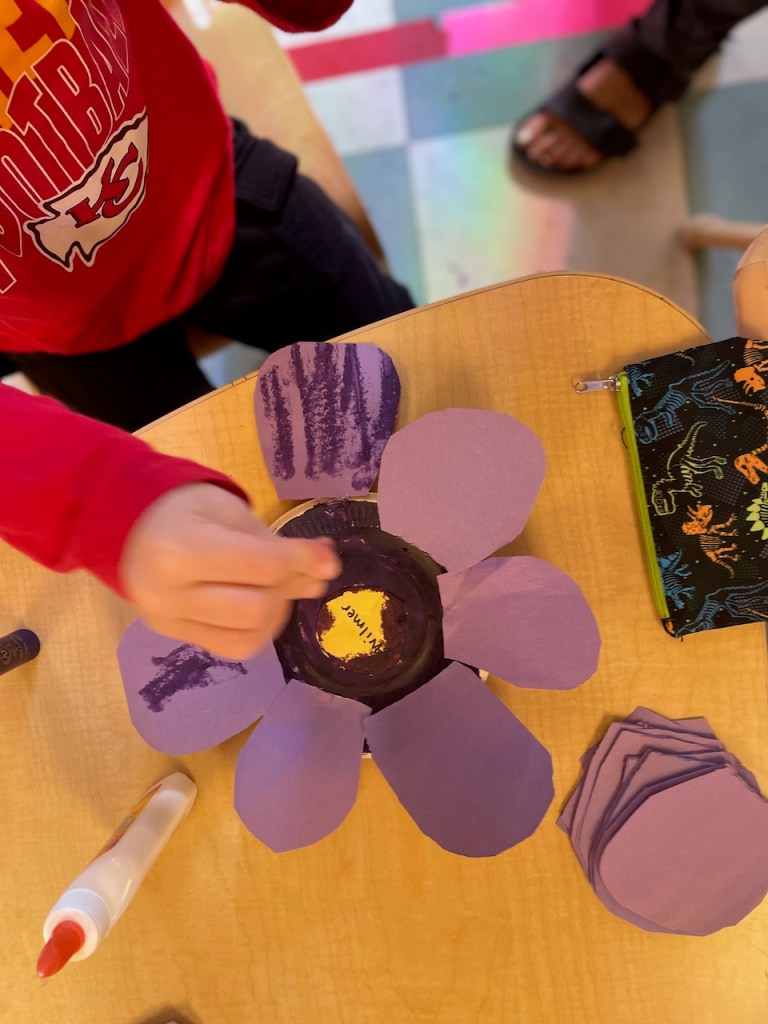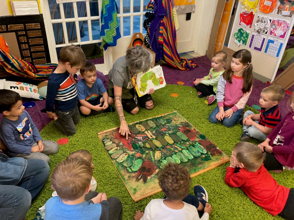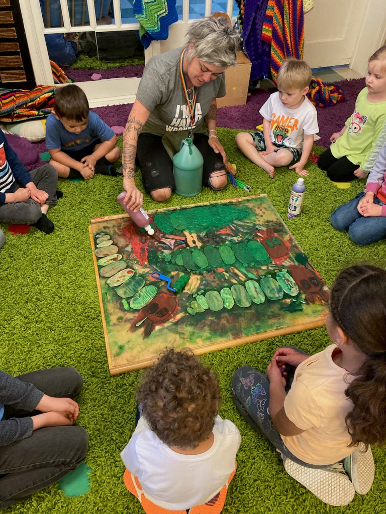 Ms Kristin made a print block using foam pieces in the shapes of the very hungry caterpillar. There is a big butterfly that we will do during the last week of preschool too.