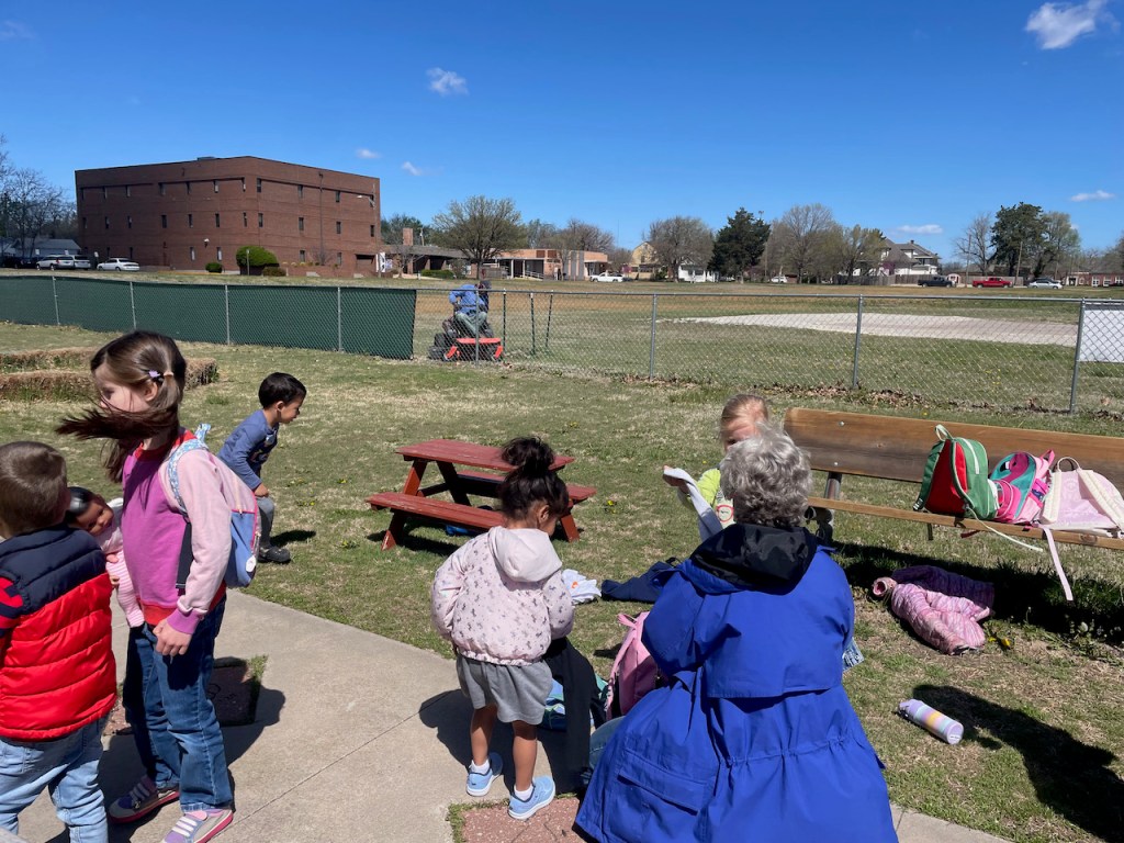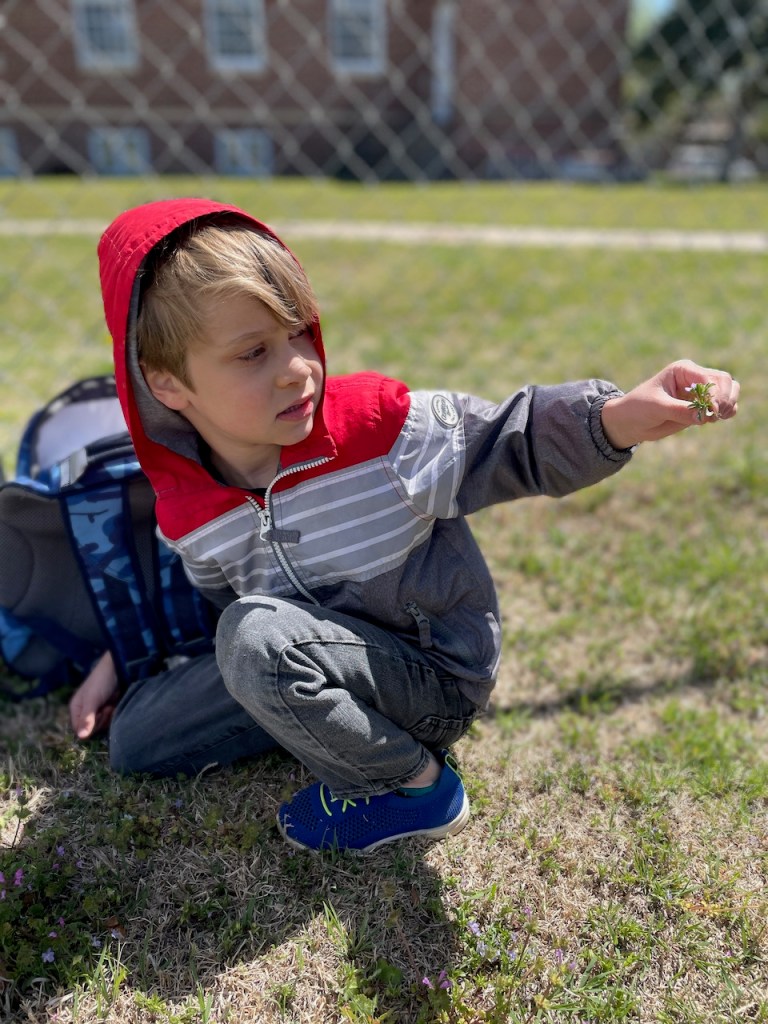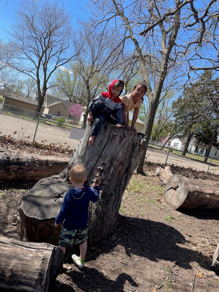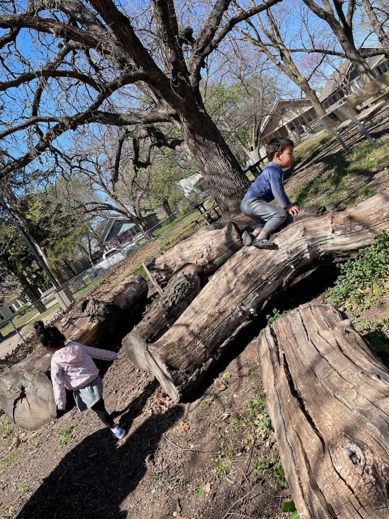 We had a lot of wind along with the lawn mower today. There was a lot of log climbing, jungle gym climbing, ball kicking, wild onion eating, log hauling, mushroom hunting, hiding from the wind, cart riding and showing Show and Tell items.