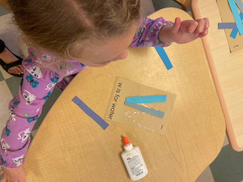 The letter W! We used different shades of blue to represent water (even though water itself is often clear or muddied). At Circle Time we had a conversation about What We Know About Water.
