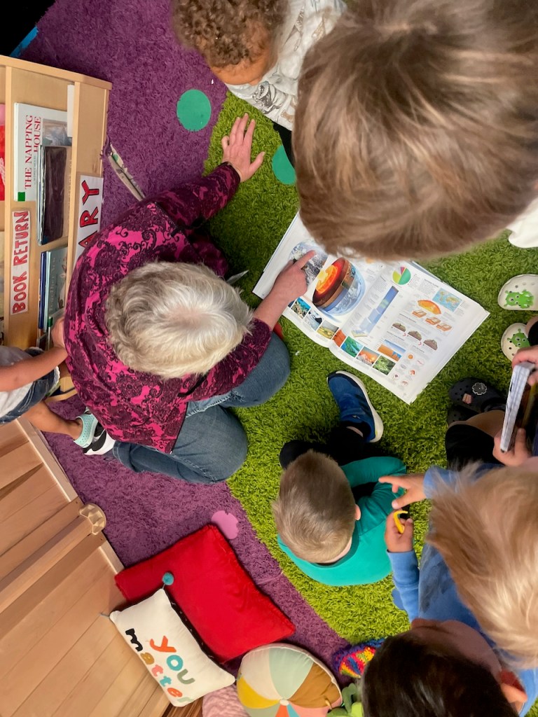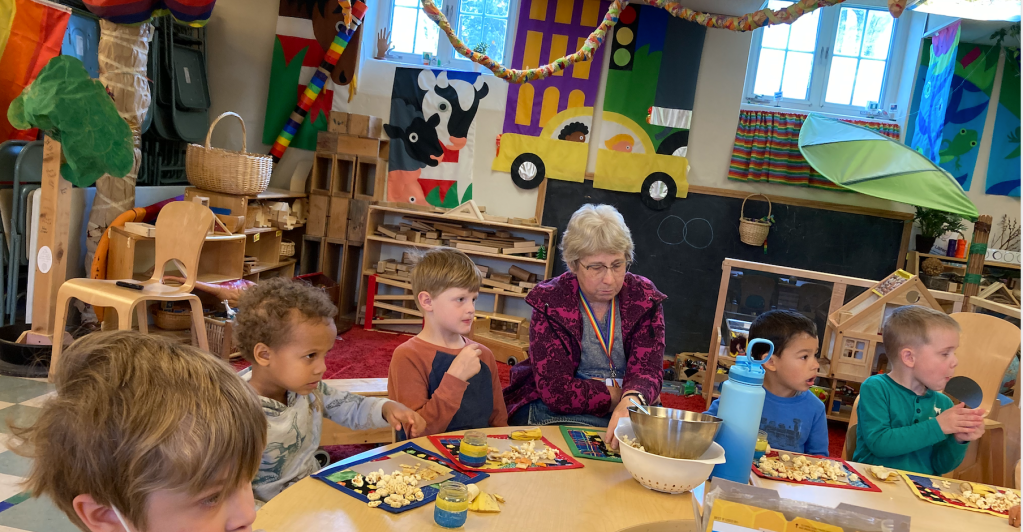 We also enjoyed the rest of our popcorn outside until the wind blew it away! Good thing we ate most of our snack inside today while listening to a story. Thank you, Asher for bringing “perfect” bananas and popcorn!
