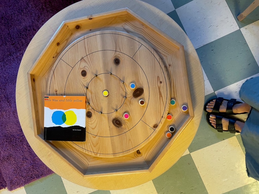 Since our crokinole pieces have colored dots on them, it reminded me of the book Little Blue and Little Yellow so we read this during Work Time too.