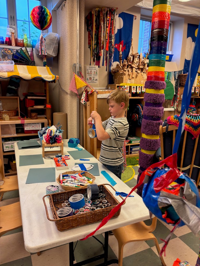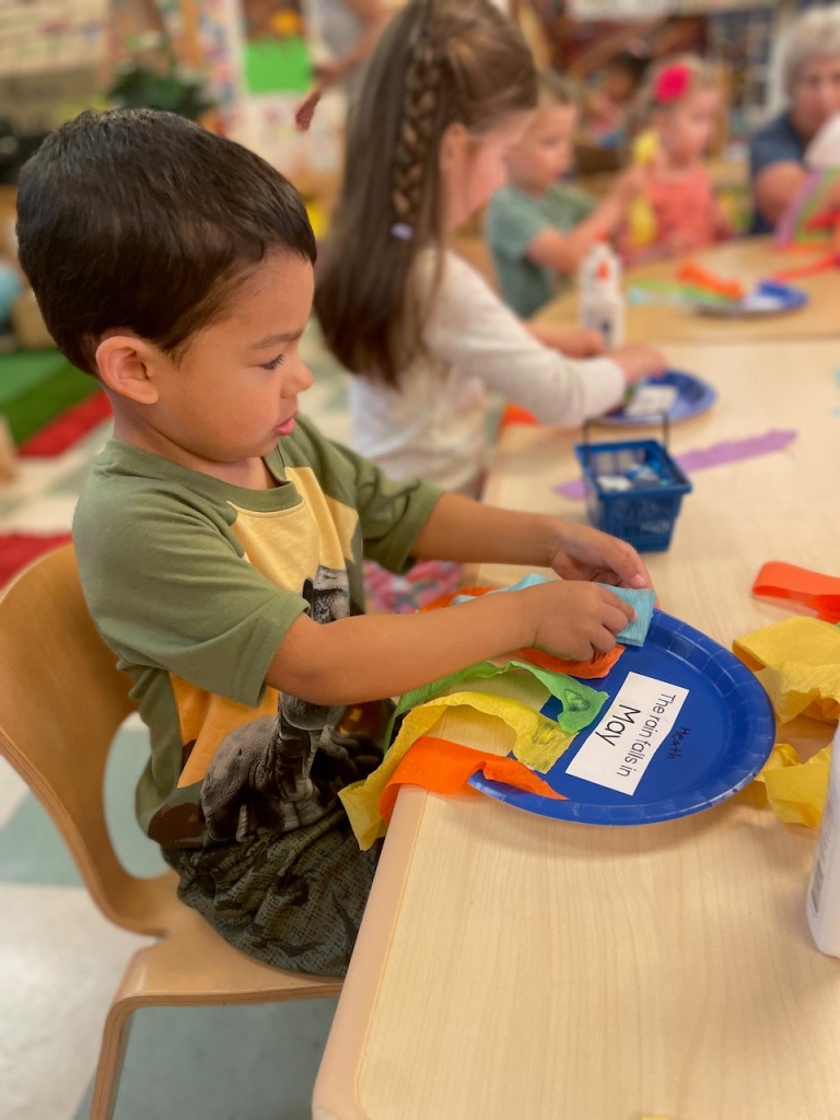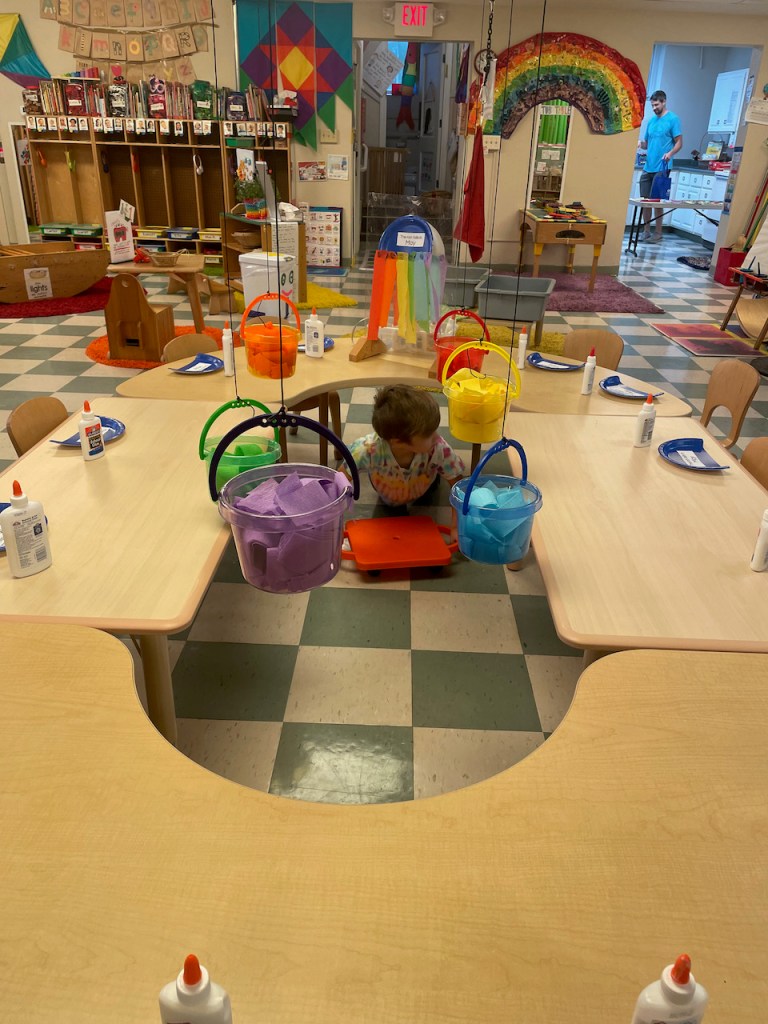 Ms Kristin had the paper strips in buckets hanging from the ceiling. They could get the colors they wanted in any way they wanted: crawling under, having a friend swing them the bucket, climbing on the table, using a scooter to get under, etc. Bonus: inevitably they looked up to see how the buckets were suspended.