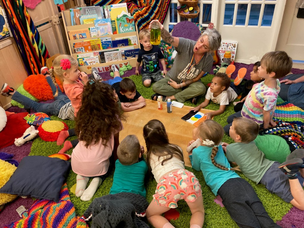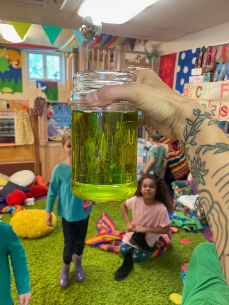 Once upon a time there was a jar of clear water and 13 children looking at it. Then some yellow liquid paint went in and all the water turned yellow! Then one drop of liquid blue paint went in. The blue drop started to move and sink. The children left the jar to go wash their hands and eat snack. When they came back later, something happened to water!