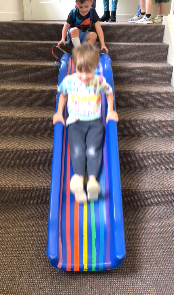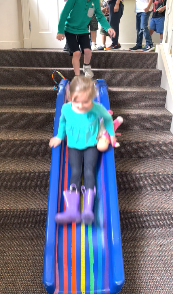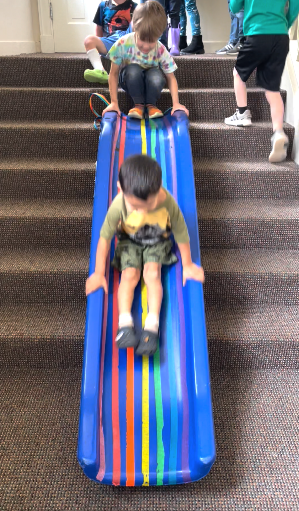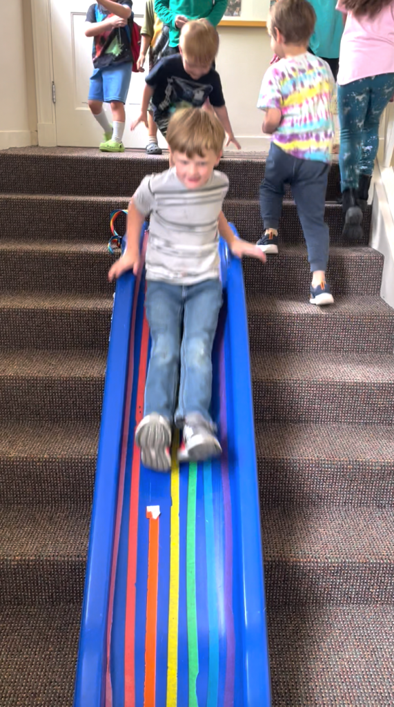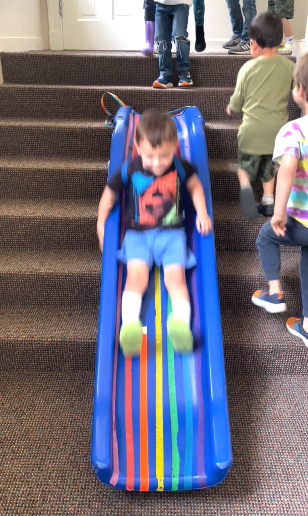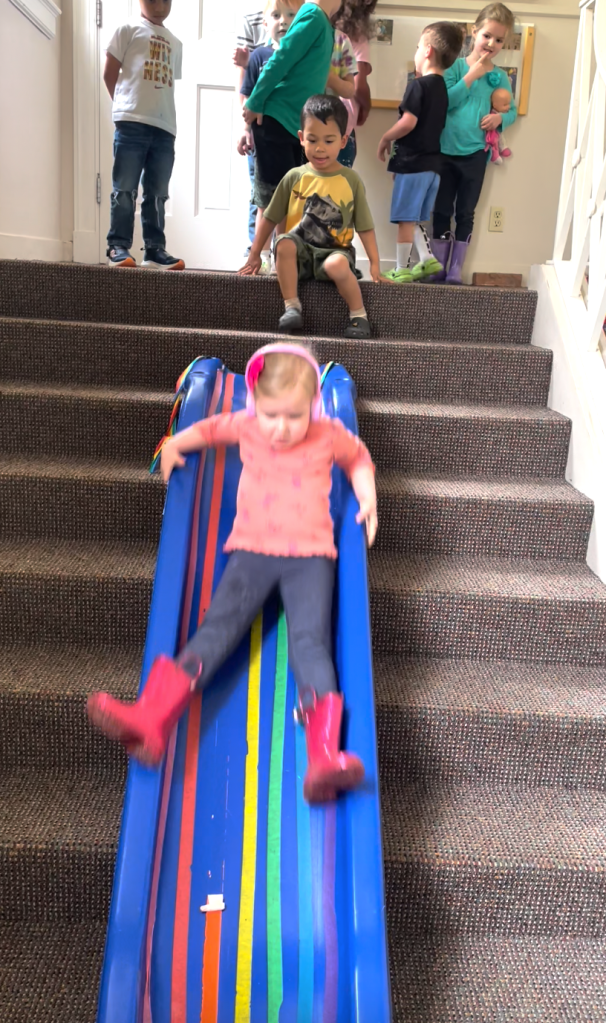 On the big steps! After clearing our snack spots and getting shoes on, children could come take turns on the slide.