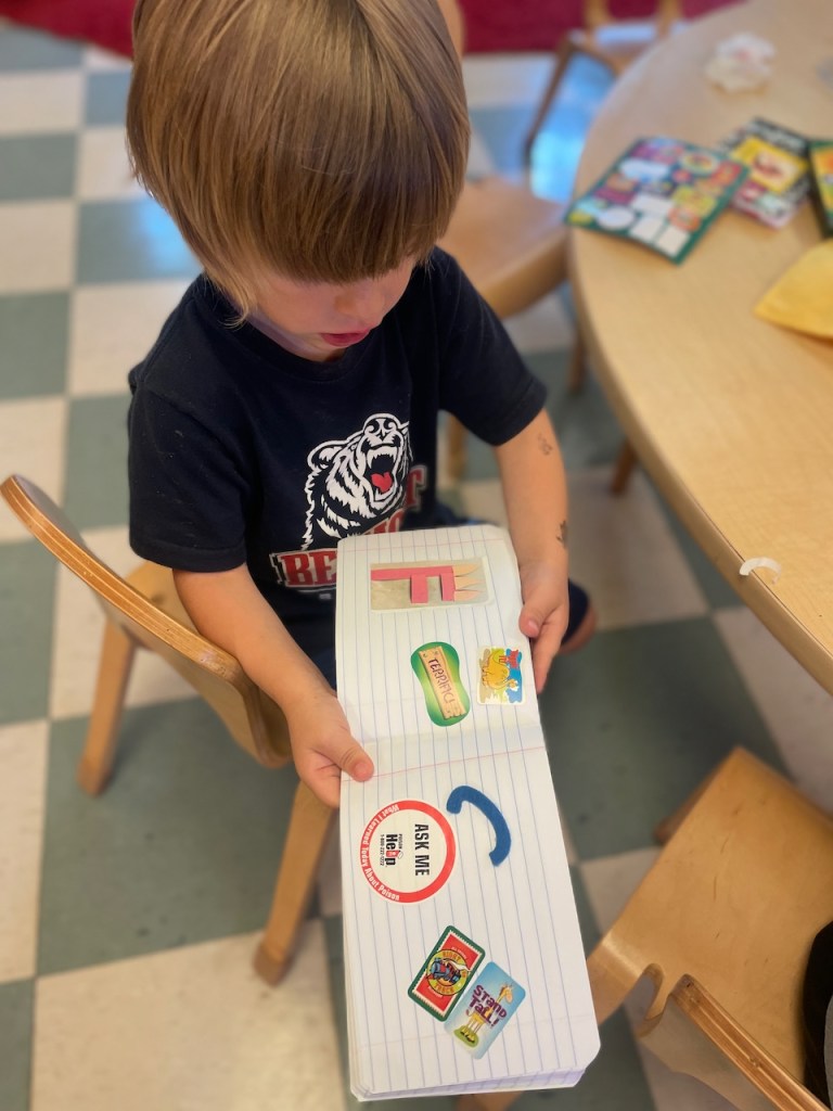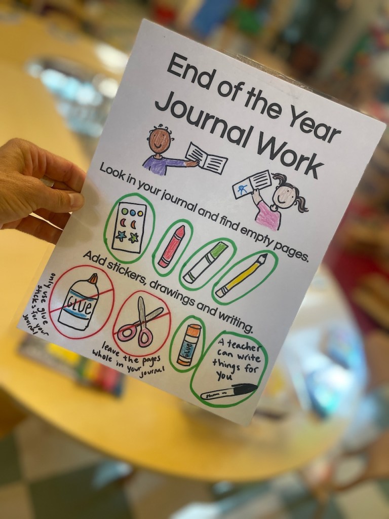 Once upon a time there was a school with 38 journals in it. These little books were used all school year. Every week a teacher put words in the journal. Children added more words, drawings, colorings, scribbles and stickers. They always put them back on the shelf and never took them home. Then one day the teacher told them something exciting…